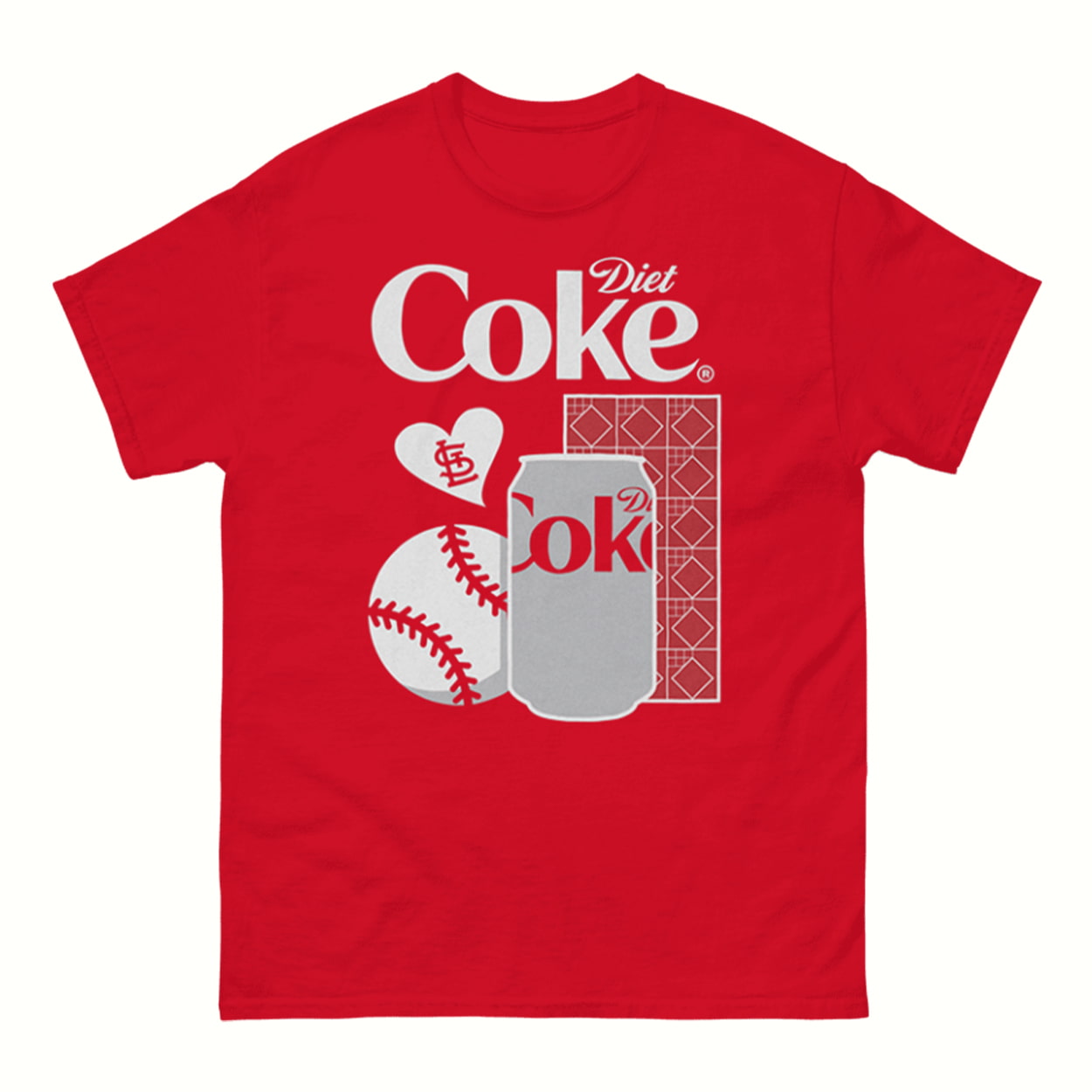 This tee offers a playful mashup of beloved pop culture and stadium aesthetics. The front design prominently features the classic Diet Coke logo stacked above an intricate, themed collage. This centerpiece includes a detailed beverage can, a baseball, a geometric diamond backdrop, and a stylized heart proudly displaying the interlocking St. Louis Cardinals ‘StL’ logo, creating a perfectly balanced tribute to both iconic brands.