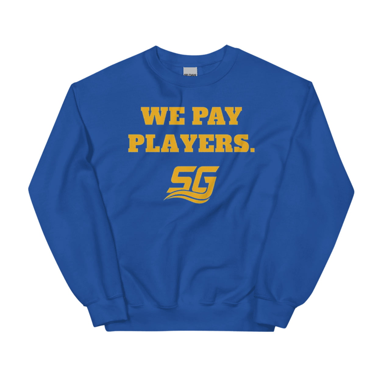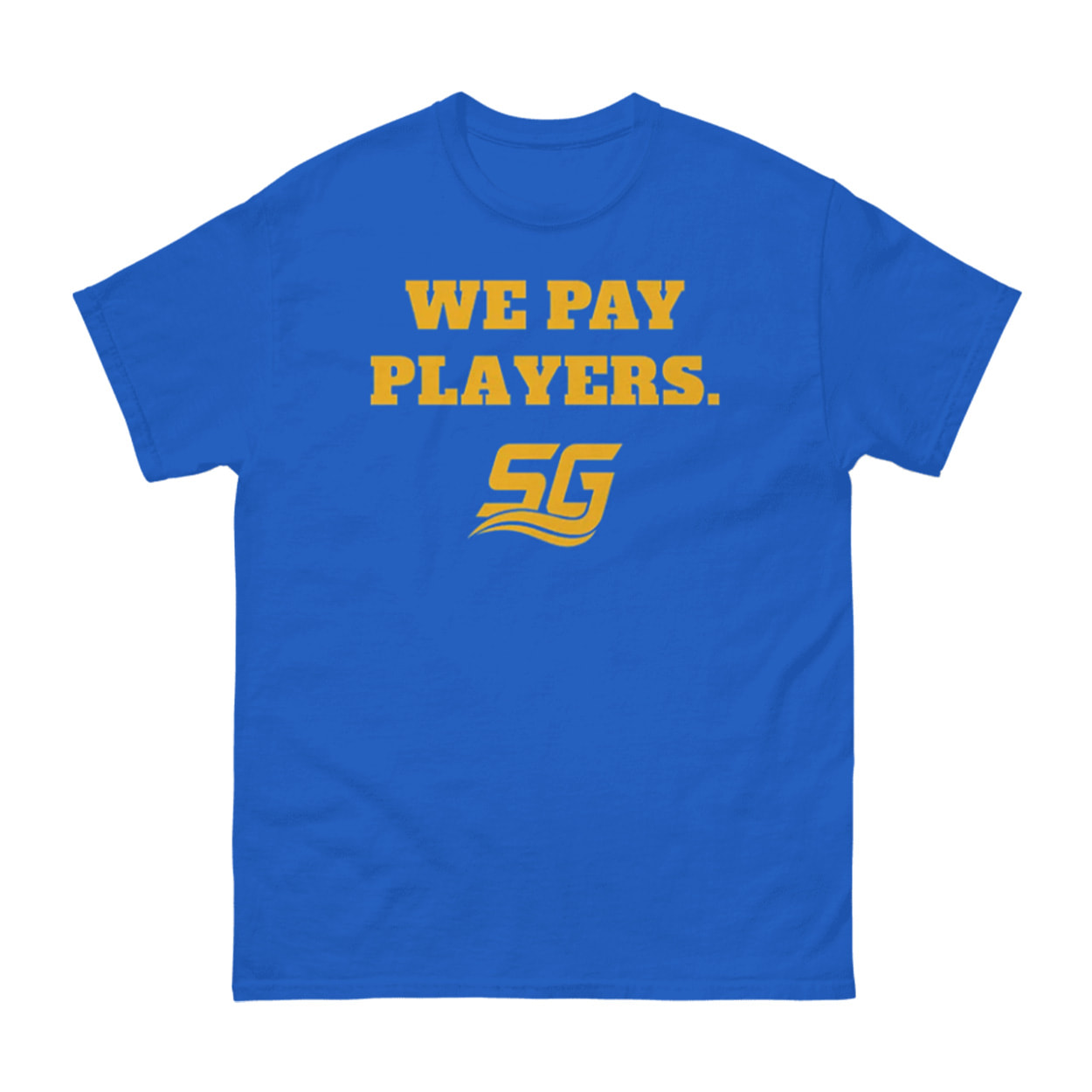 This shirt features a direct, three-word statement in bold gold lettering: “WE PAY PLAYERS.” The design utilizes a block font for maximum impact. Crucially, beneath the phrase is a stylized gold logo that includes the initials SG and a wave motif, identifying it as the official gear of the fictional South Georgia Catfish football team from the hit sports comedy series.