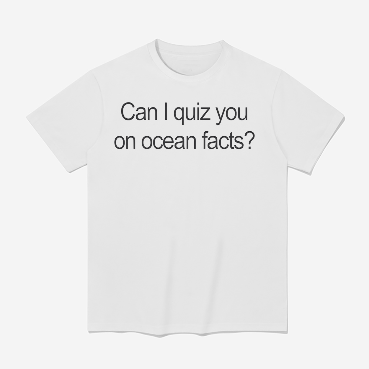 Capture the specific, quirky aesthetic of your favorite TV character with this Can I Quiz You On Ocean Facts Shirt. The design is intentionally minimalist and “chronically online,” featuring the question “Can I quiz you on ocean facts?”.