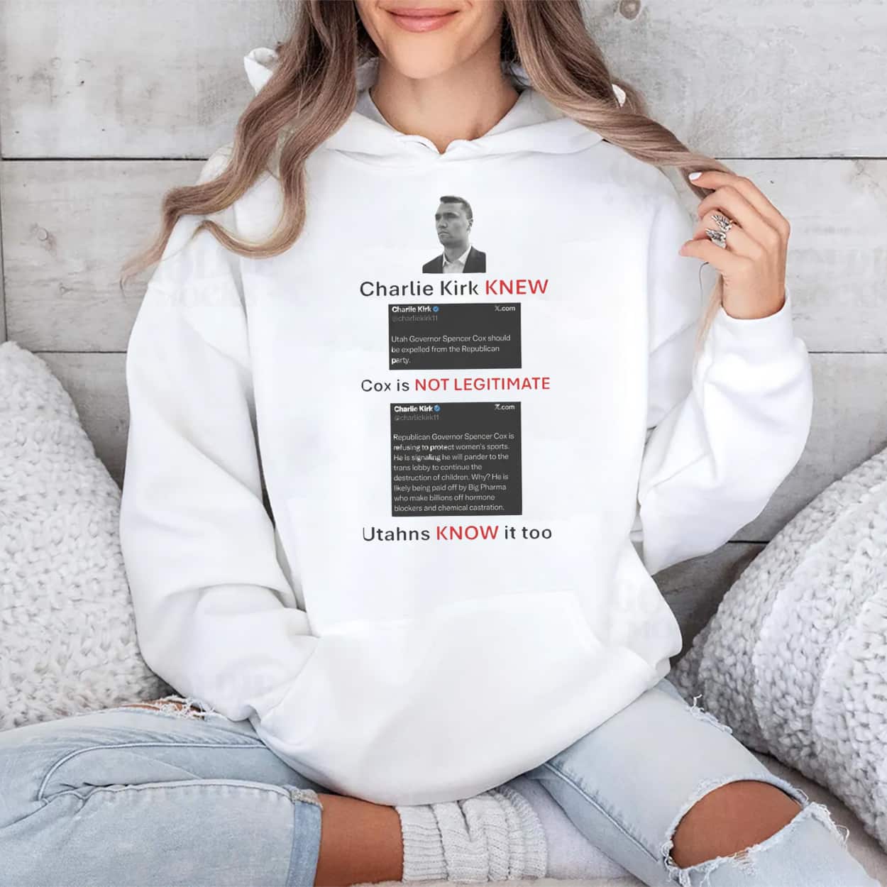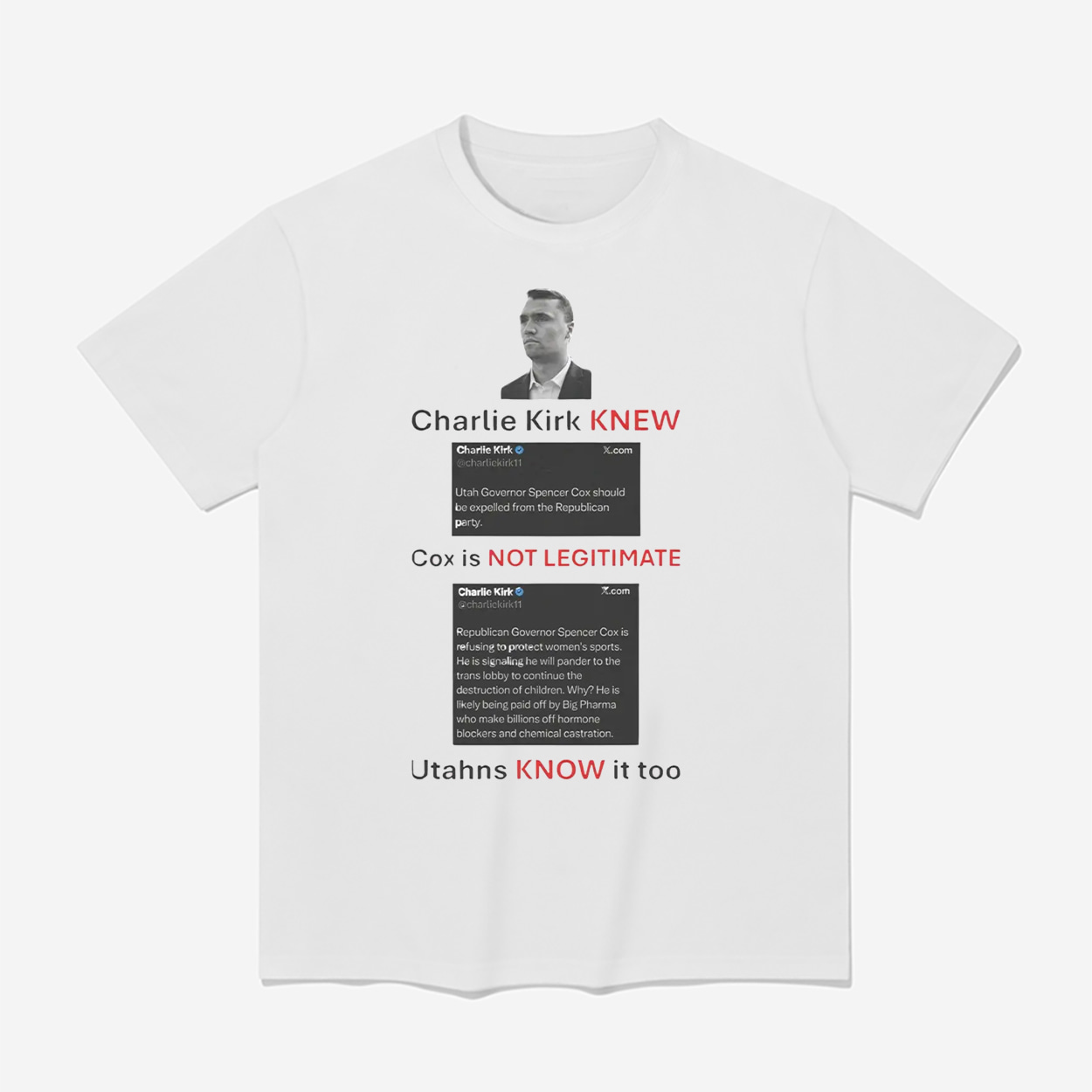 This shirt presents a monochrome image of political commentator Charlie Kirk alongside blocks of text. The design is formatted to resemble viral social media posts, with bold red and black lettering emphasizing the phrases “Cox is NOT LEGITIMATE” and “Utahns KNOW it too.” This striking, unfiltered visual presentation ensures the political message is highly visible and immediately communicates the wearer’s viewpoint.