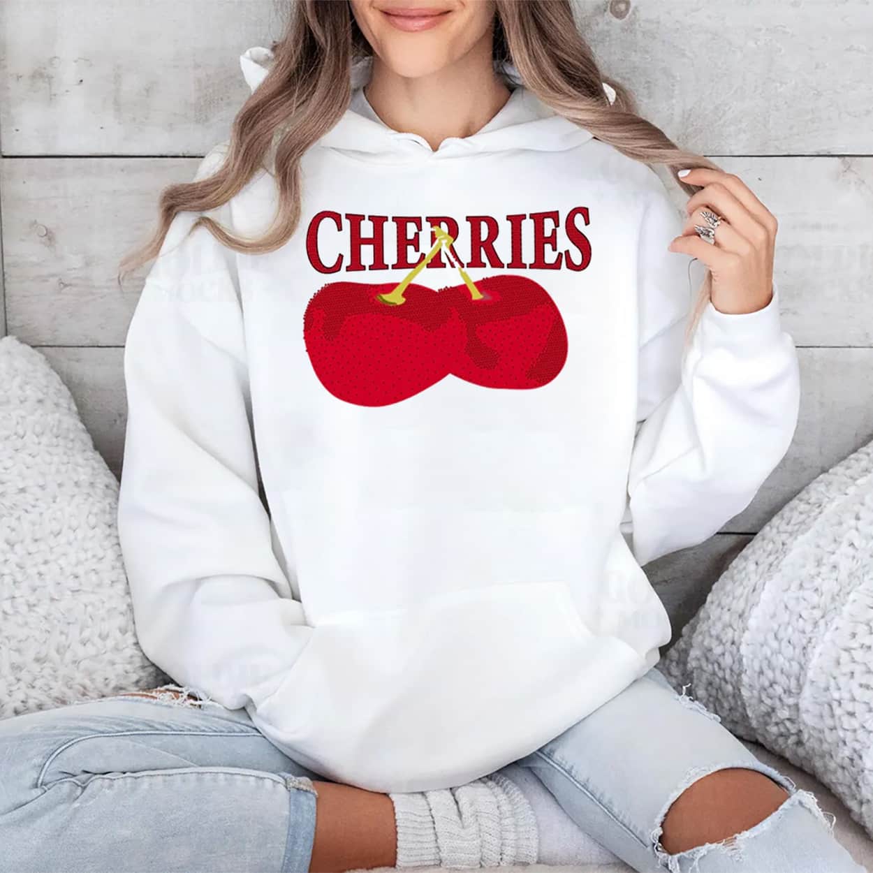 Embrace comedic flair with the Cherry Daddy Issues Cherries Shirt. The design showcases “CHERRIES” in arched, distressed red lettering above a textured pair of connected red cherries with yellow stems, evoking a fun, fruit-inspired motif without additional logos for a clean, eye-catching statement.
