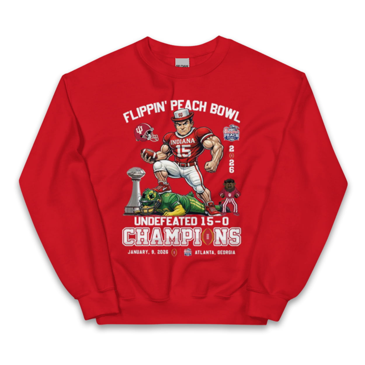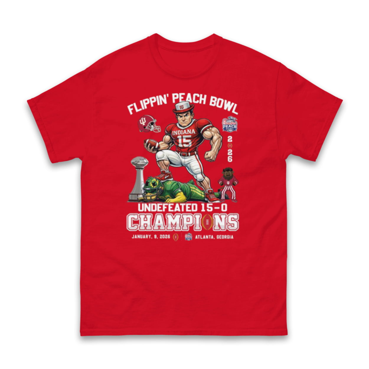 Capture the swagger of a perfect season with this dynamic victory tee. The design centers on a powerful illustration of a muscular Indiana Hoosier player (wearing jersey #15) triumphantly stepping on a defeated Oregon Ducks player, symbolizing total dominance on the field. The graphic is framed by the spirited slogan “FLIPPIN’ PEACH BOWL” at the top and the massive declaration “UNDEFEATED 15-0 CHAMPIONS” at the bottom, celebrating the team’s flawless record.
