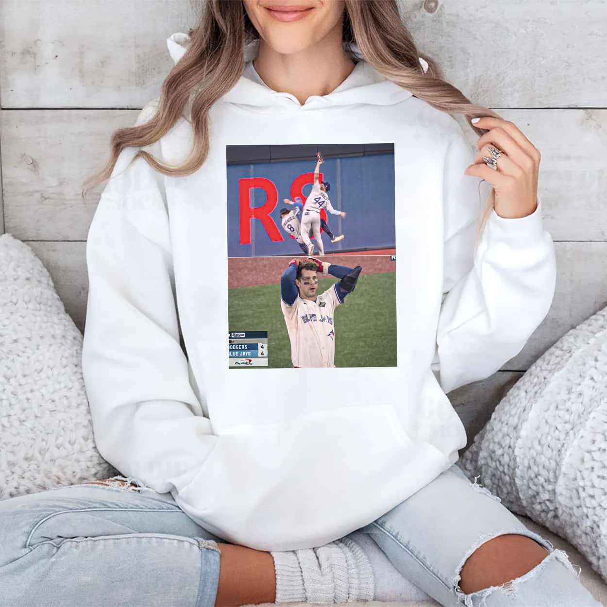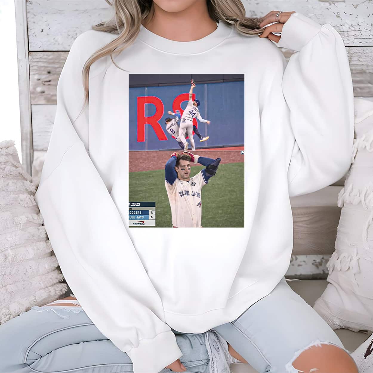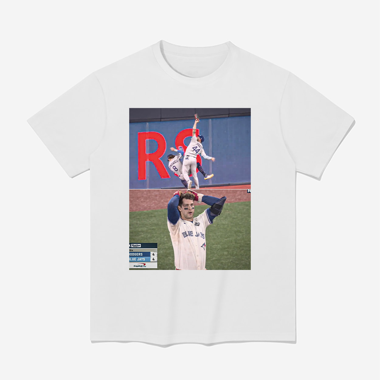 This t-shirt captures the single most incredible and defining play of the 2025 World Series. The top graphic is a high-quality photo of the now-legendary “circus catch” by Dodgers center fielder Andy Pages, showing him leaping at the wall and colliding with Kiké Hernández (#8) to make the game-ending out. The bottom graphic captures the immediate aftermath: the look of stunned disbelief on the face of a Blue Jays player, with the 11th-inning scoreboard (Dodgers 5, Blue Jays 4) sealing the game.