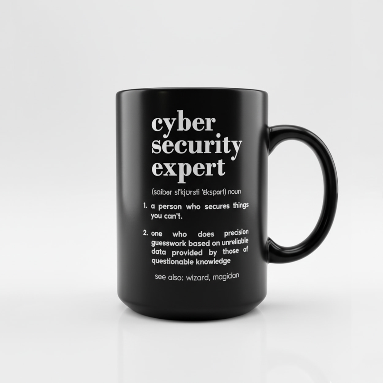 Finally, an accurate definition for “Cyber Security Expert”! This Cyber Security Expert Noun Mug defines the job as “one who does precision guesswork based on unreliable data” and “see also: wizard, magician.” It’s the perfect, hilarious, and relatable coffee cup for any IT or cyber security professional with a sense of humor.