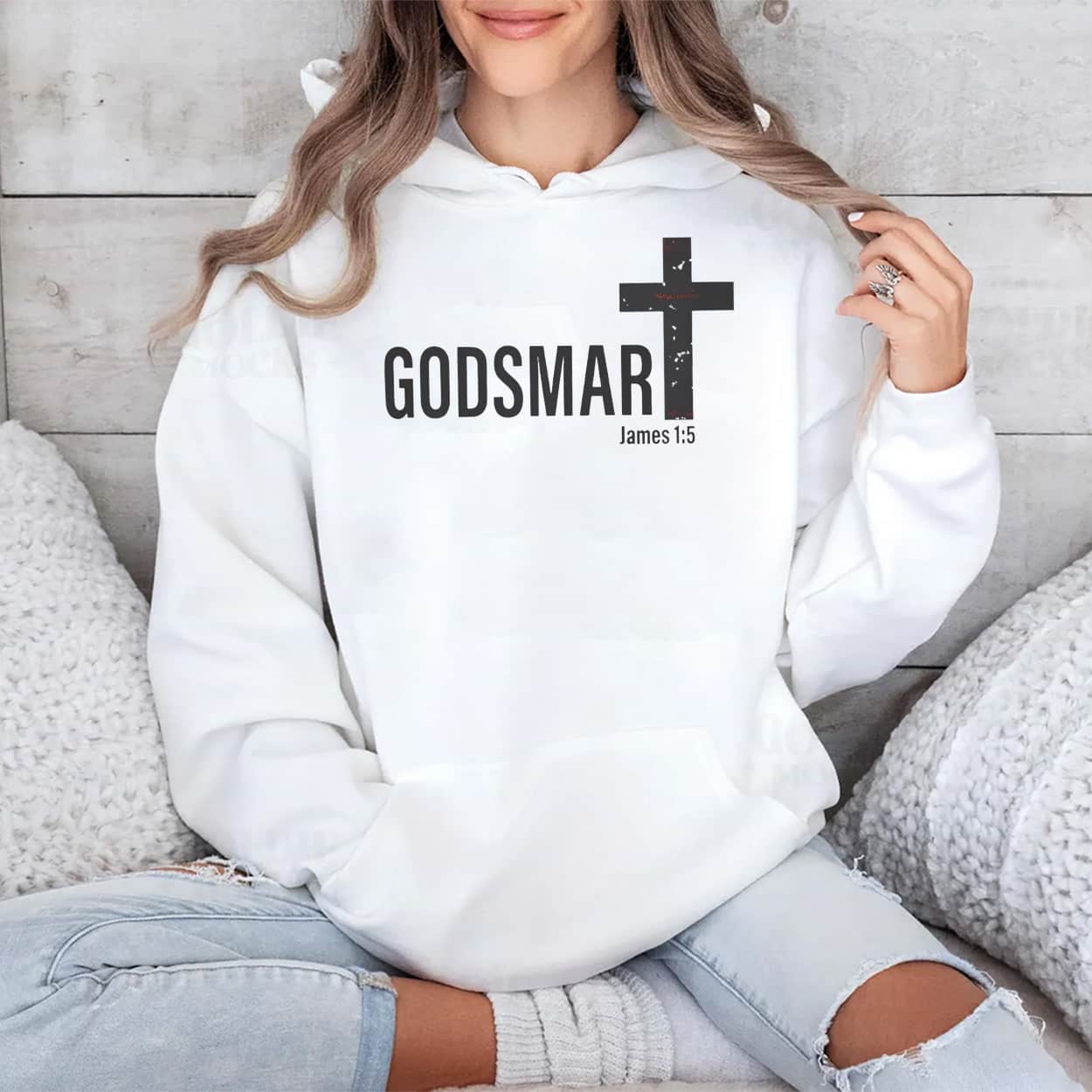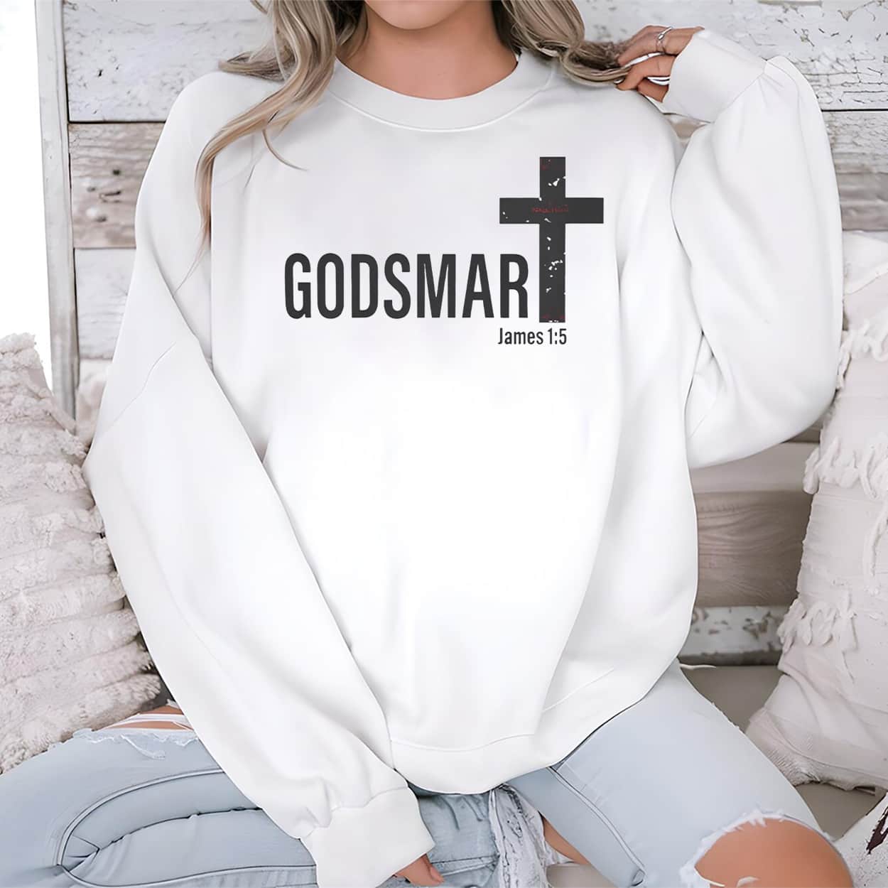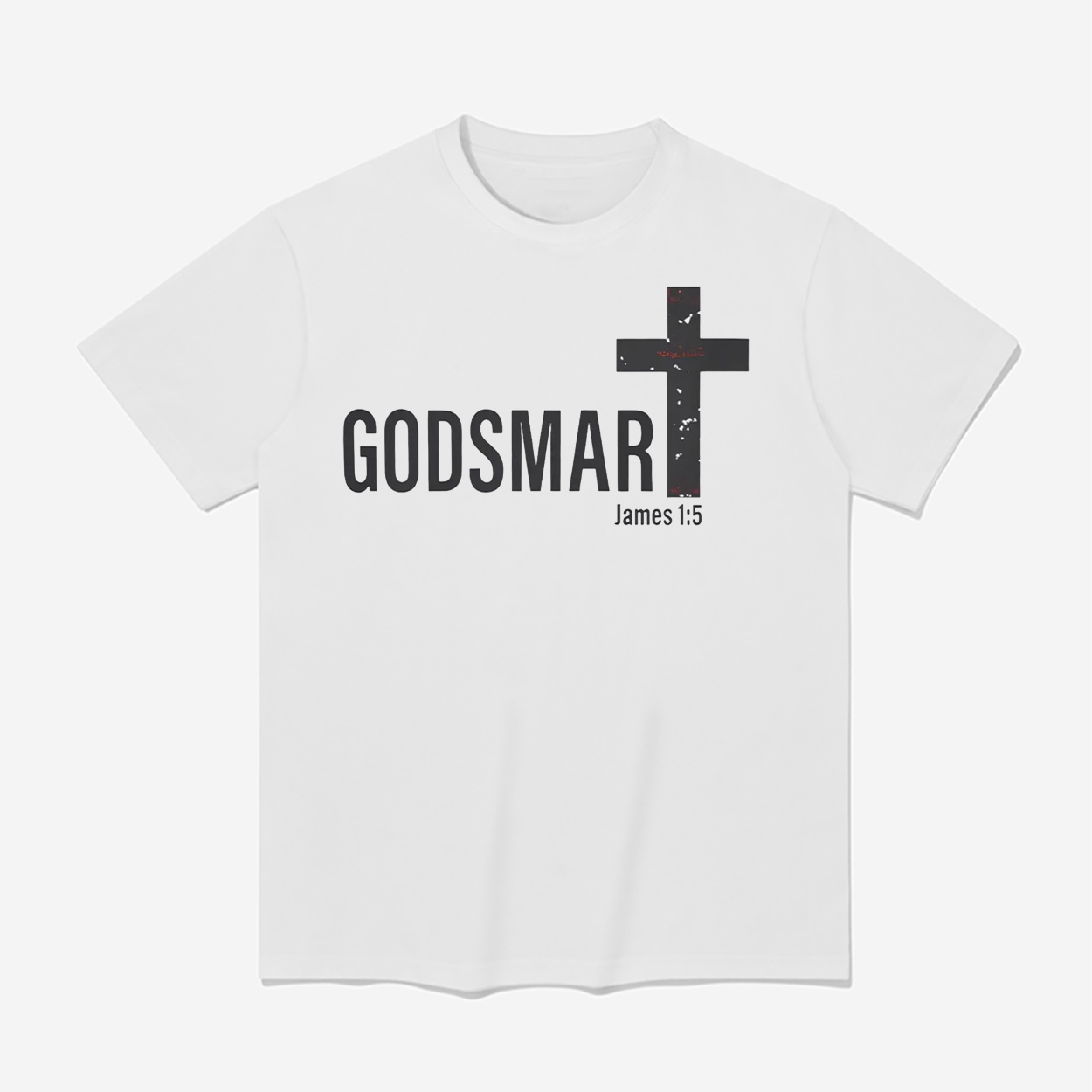 The t-shirt features the bold, distressed word “GODSMART” positioned next to a matching distressed cross graphic. Below the cross, the New Testament Bible verse reference “James 1:5” is clearly printed. The simple, striking white t-shirt design with black and subtle red text ensures a focused and powerful message.