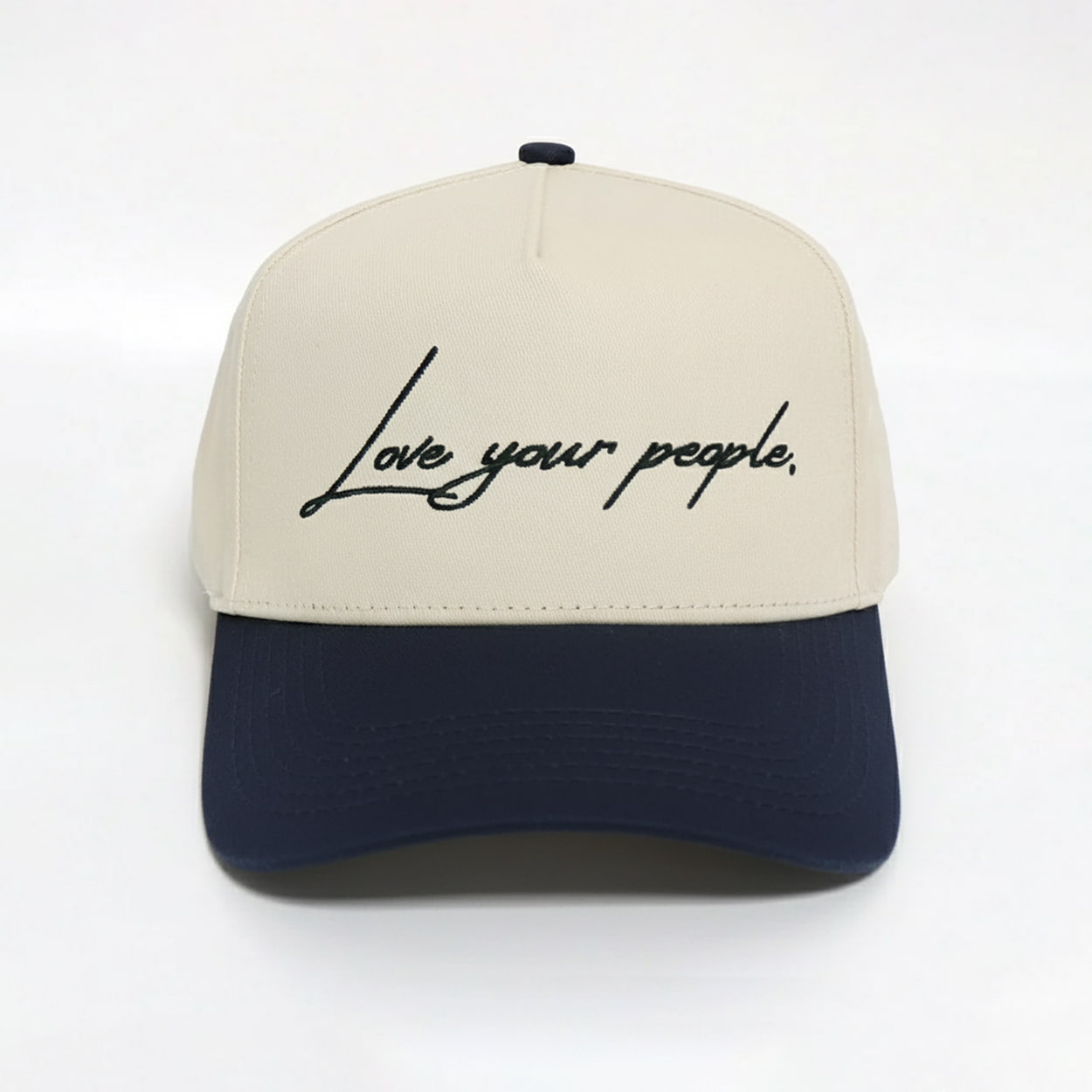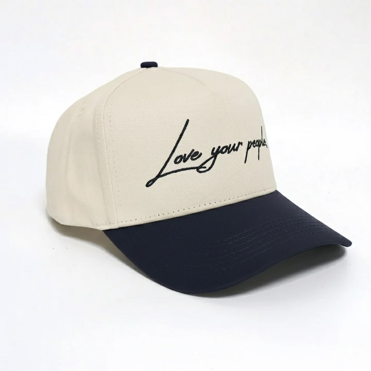 Turn heads and spark conversations with this hat. This hat features a clean cream crown paired with a deep navy brim, creating a crisp contrast that’s both classic and modern. Front and center, the phrase “Love your people” is scrawled in a handwritten-style script, giving it a personal, lived-in feel—like a note from a friend or a mantra from the heart. Whether you’re post-game chilling or out making moves, this hat is your reminder to lead with love.