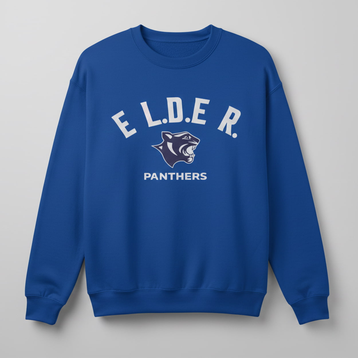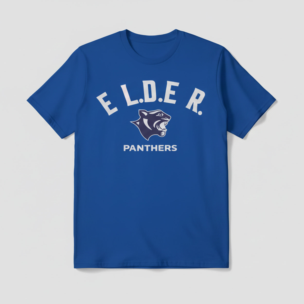 The Dave Portnoy Elder Panthers Shirt highlights a classic varsity design with “E.L.D.E.R.” arched in white block letters above a fierce panther head graphic, and “PANTHERS” below in matching style.