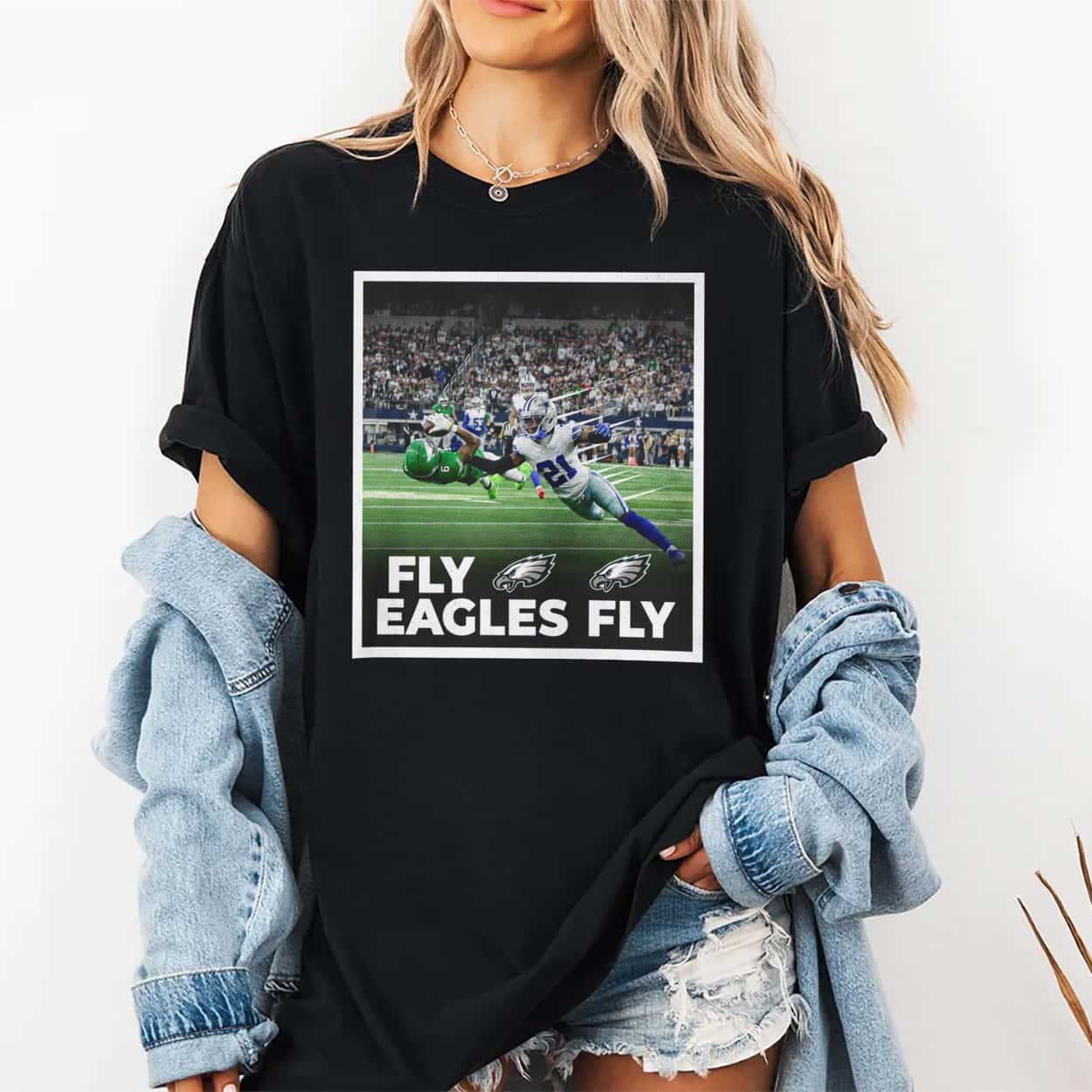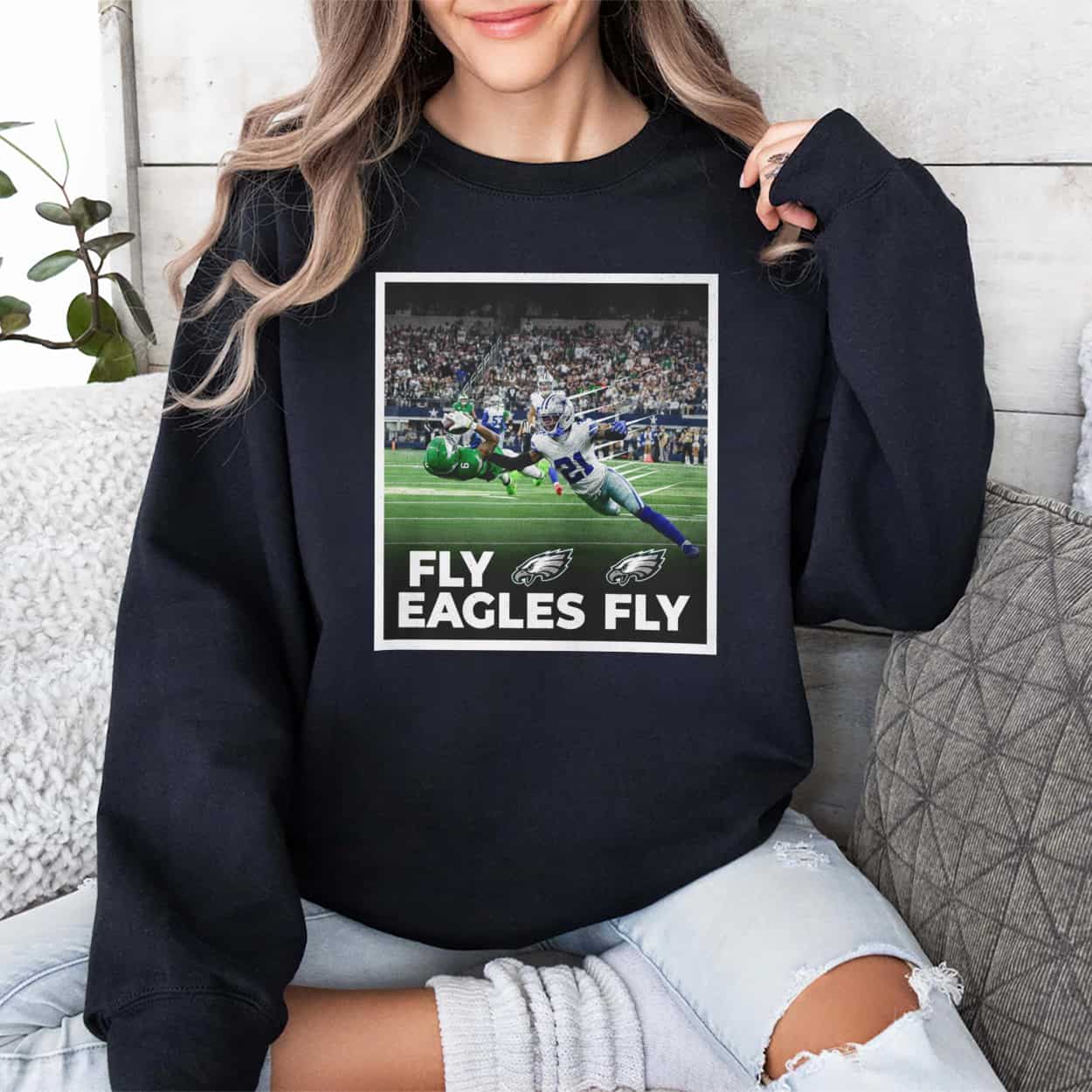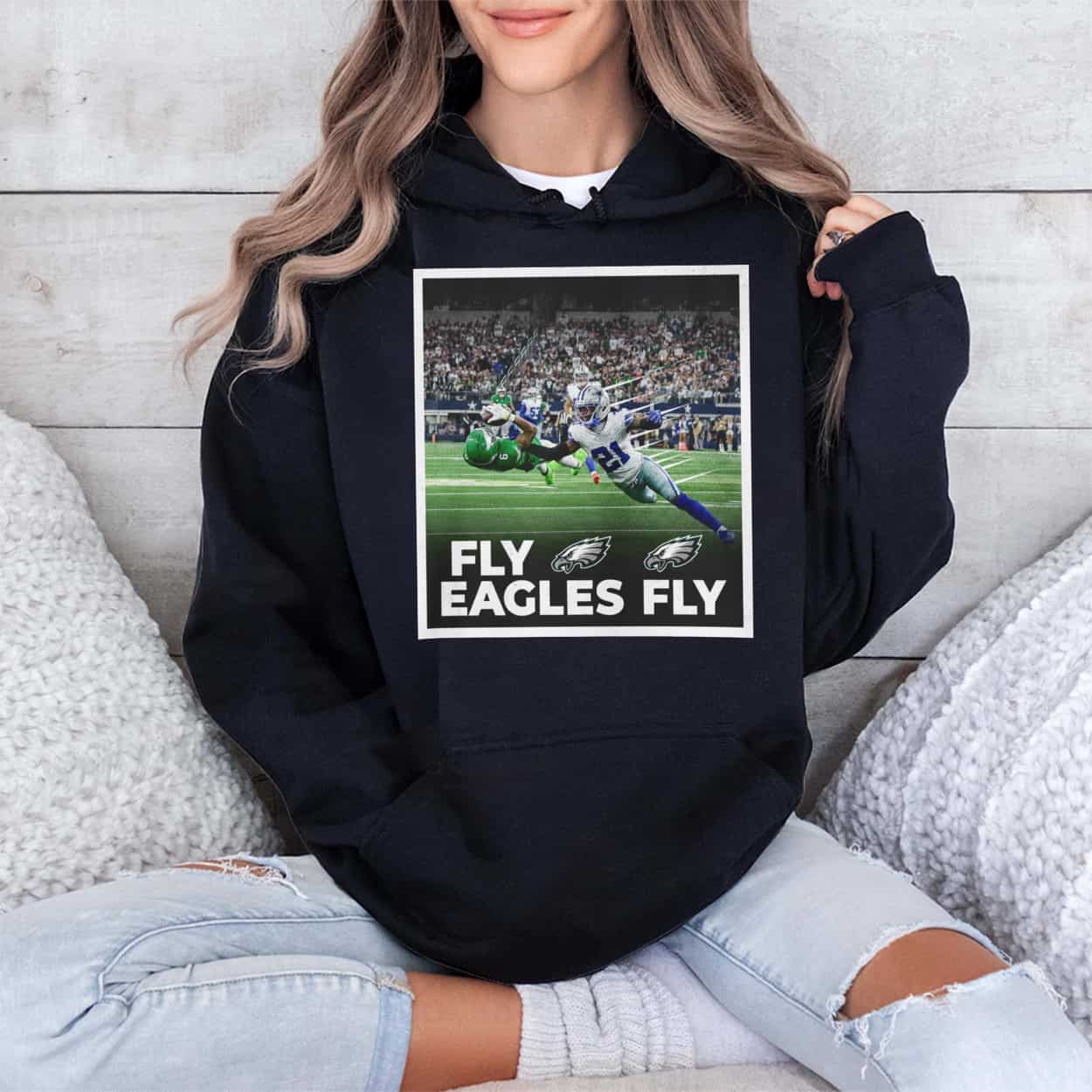 The DeVonta Smith Touchdown Fly Eagles Fly Shirt captures a high-energy design with a bordered photo of Smith diving for the catch mid-air, evading a Cowboys defender in a packed stadium. Below, bold white “FLY EAGLES FLY” text flanks two Eagles logos, creating a motivational focal point on a sleek black base.