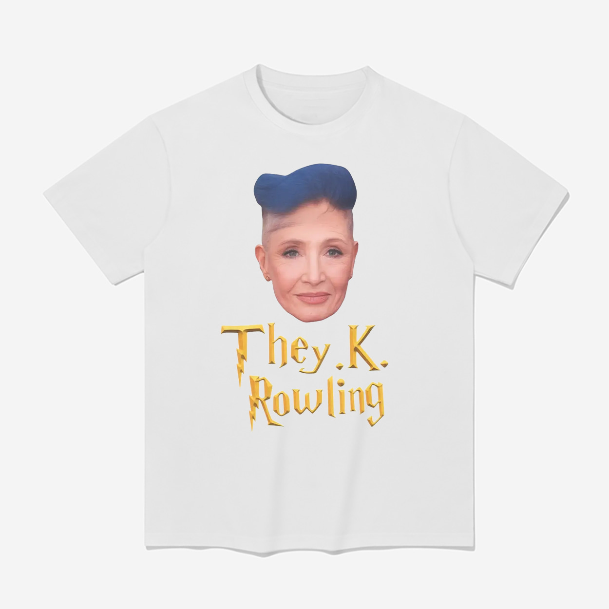 Centered front print shows J.K. Rowling’s portrait above the text “They. K. Rowling” set in a wizarding-inspired font with lightning-bolt accents, printed in high-contrast ink for strong visibility.