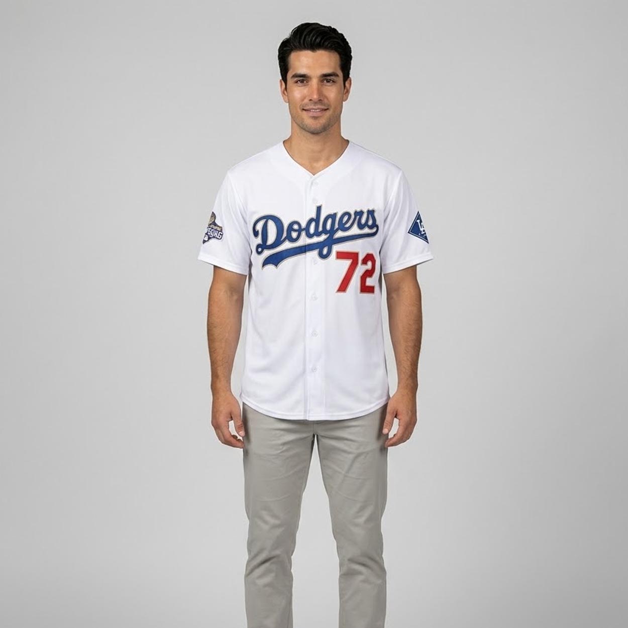 This baseball jersey features the iconic Dodgers front script and prominent player numbering, elegantly outlined by championship-inspired trim. The sleeves are accented with an exclusive patch commemorating the historic title victories, delivering a premium, authentic athletic aesthetic.