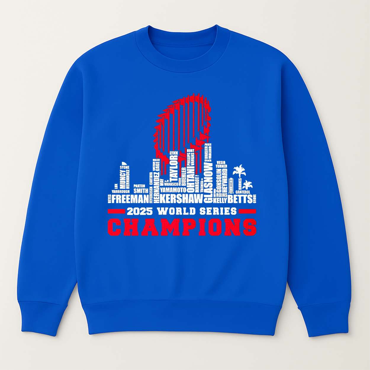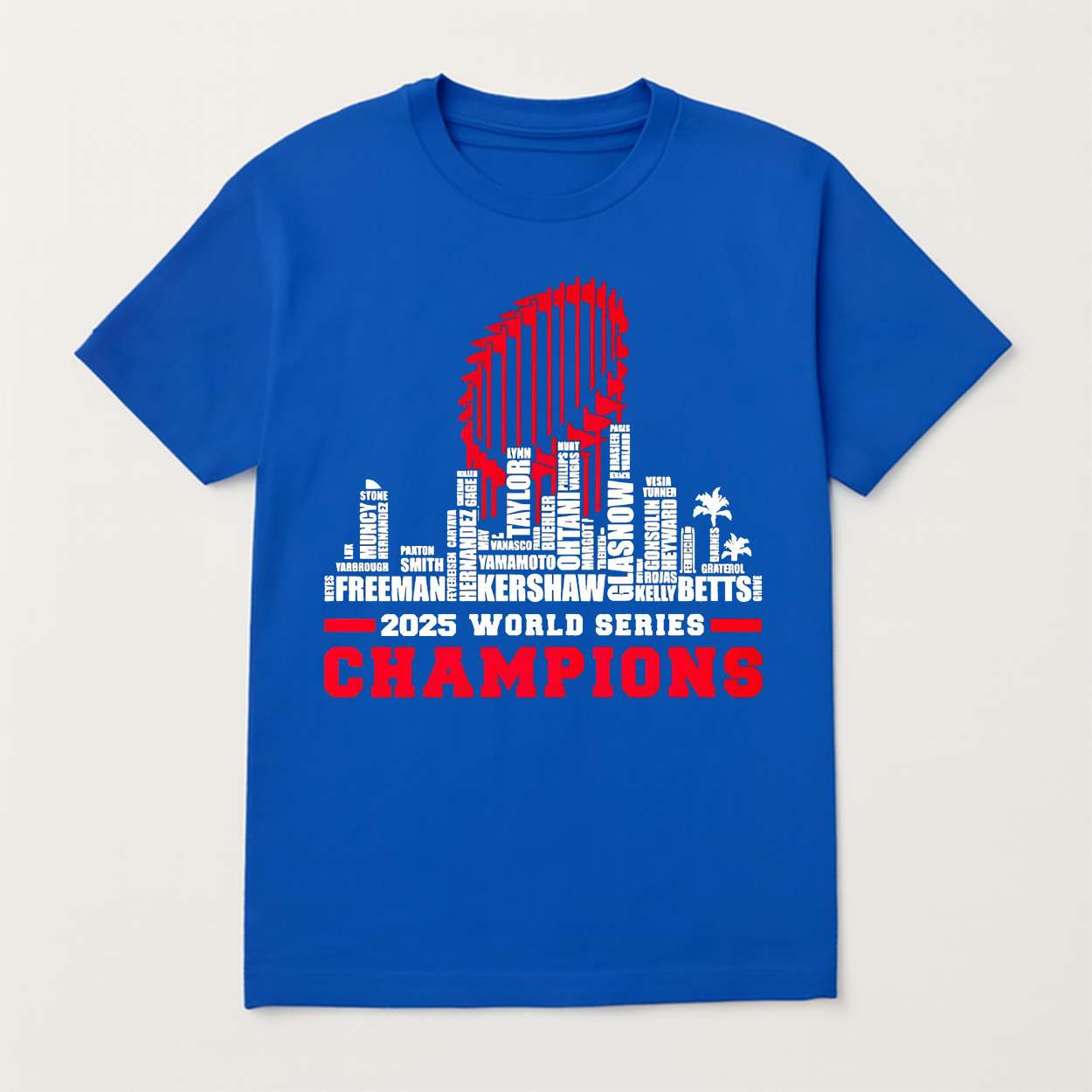 The Dodgers’ 2025 World Series victory marked a defining moment in baseball history, clinched with a dramatic Game 6 win over the Toronto Blue Jays. This shirt captures that legacy, forming a skyline from the names of every player who shaped the season.