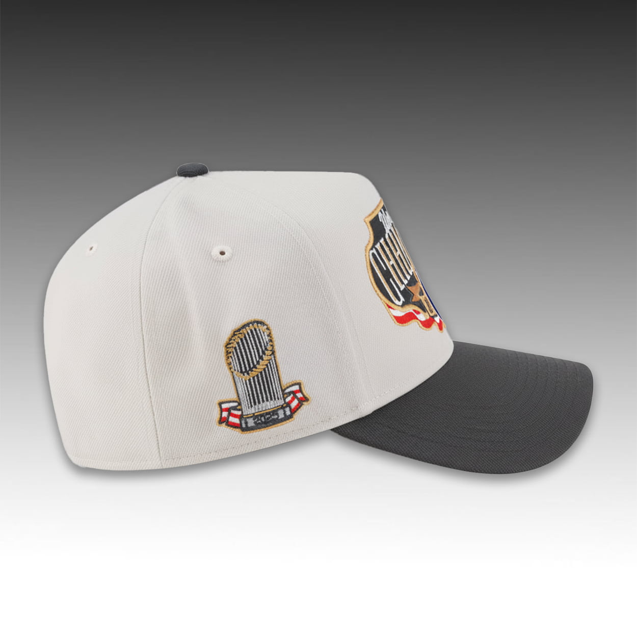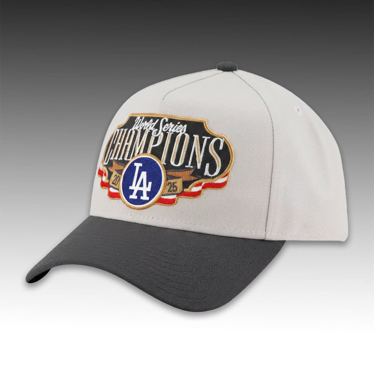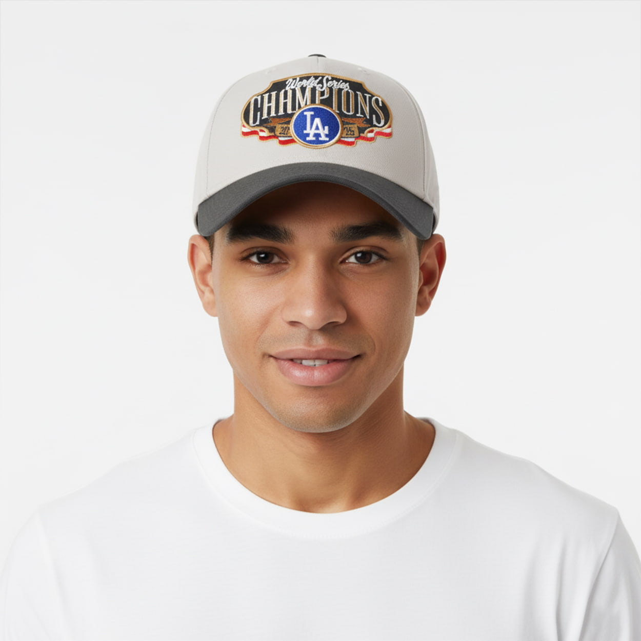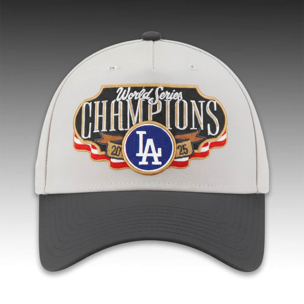 Celebrate the Dodgers’ historic victory with this Dodgers 2025 World Series Champions Hat. This cap is designed with a stylish two-tone look, featuring a light grey crown and a dark charcoal brim. The front is adorned with a large, beautifully detailed embroidered patch that proudly declares “WORLD SERIES CHAMPIONS” and “2025,” all centered around the iconic “LA” logo. A second embroidered patch of the 2025 Commissioner’s Trophy on the side completes this championship design.