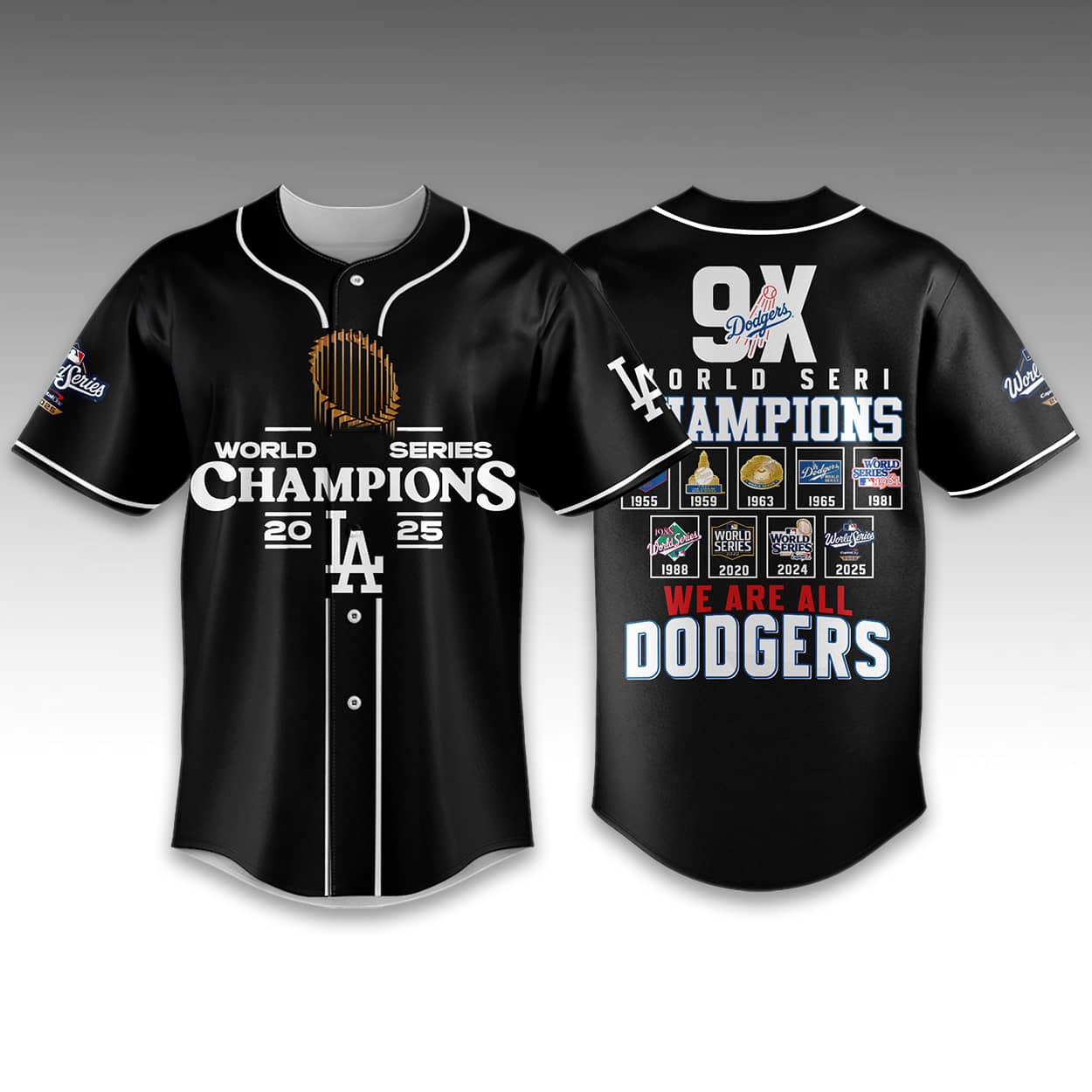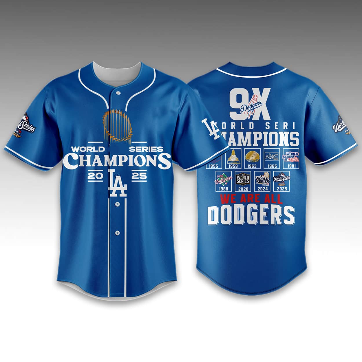 Celebrate the Dodgers’ 9th World Series win with this Dodgers 9X World Series Champions Baseball Jersey. Available in blue, black, and white, this jersey honors all nine franchise championships on the back: 1955, 1959, 1963, 1965, 1981, 1988, 2020, 2024, and 2025. With the 2025 logo on the front and “WE ARE ALL DODGERS” on the back, it’s the ultimate collector’s item.