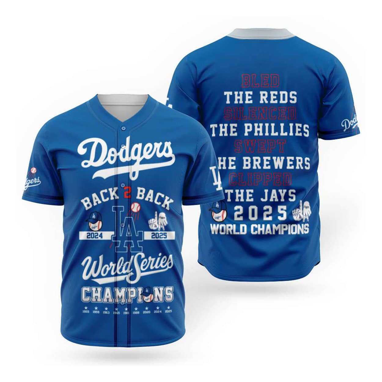 This Dodgers “Back 2 Back” World Series Champions Jersey is the ultimate celebration of a modern dynasty. This classic royal blue button-front jersey is covered in championship details. The front features the iconic “Dodgers” script above the “BACK 2 BACK” slogan, honoring the 2024 and 2025 victories. Below the “World Series CHAMPIONS” title is a complete list of all nine franchise championship years, from 1955 to 2025. The back tells the full story of the 2025 postseason run with a bold “checklist” of defeated foes: “BLED THE REDS, SILENCED THE PHILLIES, SWEPT THE BREWERS, CLIPPED THE JAYS.”