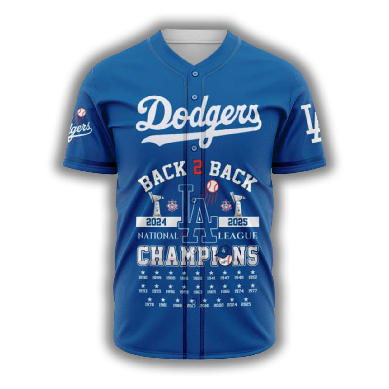Score the ultimate fan jersey: the Dodgers Back 2 Back 2025 National League Champions Jersey! Features B2B graphics, historic championship years, and a full future roster.