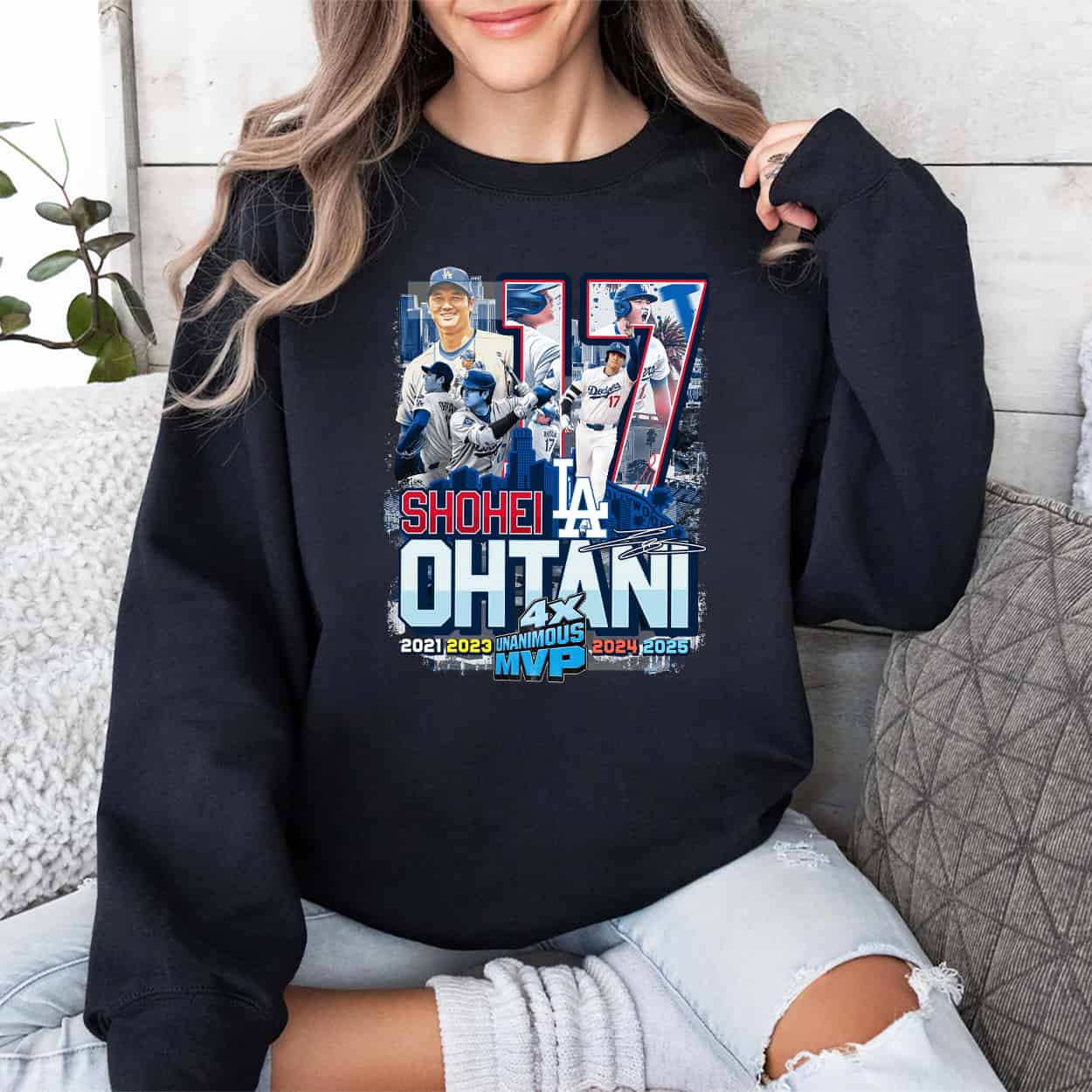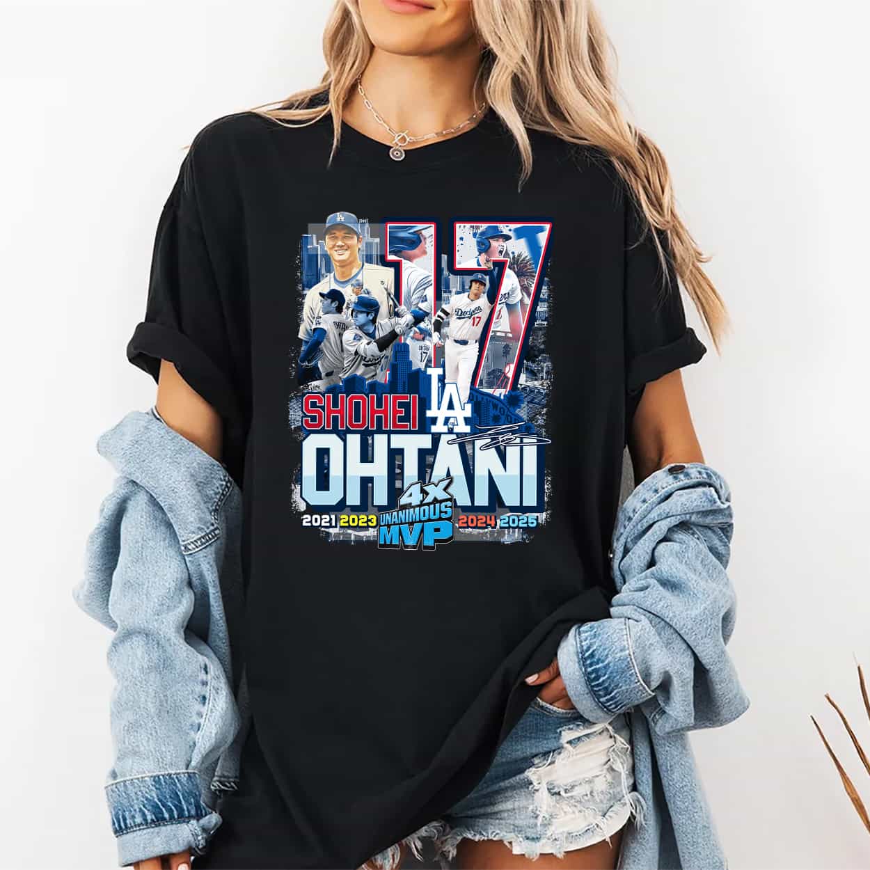 Celebrate a legend! This Dodgers Shohei Ohtani 4x Unanimous 2025 Shirt honors his historic 4x Unanimous MVP wins (2021, 2023, 2024, 2025). This tee features a stunning collage of the Dodgers superstar batting and pitching, his #17, and the “LA” logo. It’s the ultimate collector’s item for any Dodgers fan who witnessed Ohtani’s “Back to Back” MVP seasons and the 2025 World Series dynasty.
