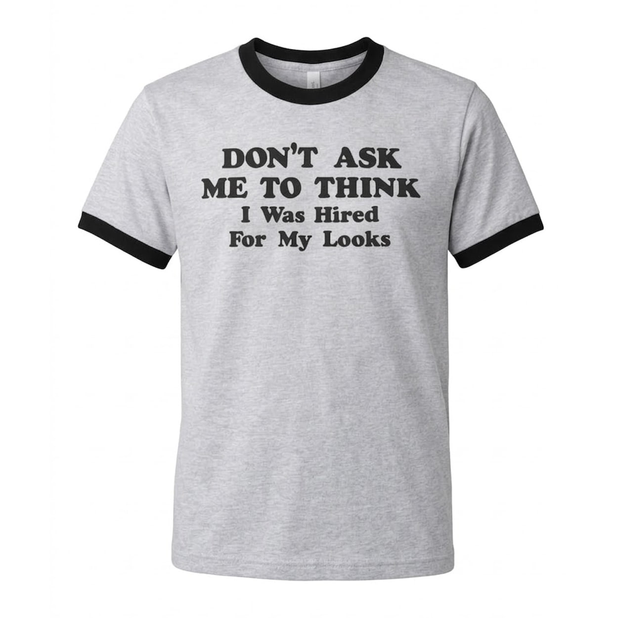 Make a bold, sarcastic statement with the Don’t Ask Me To Think I Was Hired For My Looks Shirt. This classic ringer tee features a retro-inspired contrast crew neckline and matching sleeve bands. The front of the garment prominently displays the phrase “DON’T ASK ME TO THINK I Was Hired For My Looks” stacked in a bold, vintage-style serif font. The text-based design perfectly balances a minimalist streetwear aesthetic with unapologetic, in-your-face humor.
