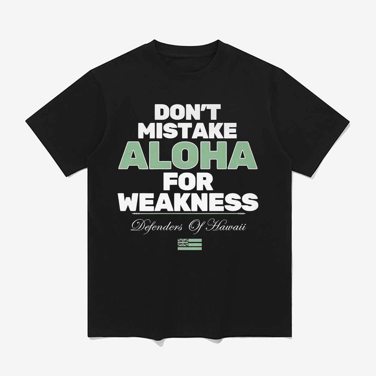This t-shirt makes a powerful statement. The front features the bold, unambiguous message, “DON’T MISTAKE ALOHA FOR WEAKNESS,” with the word “ALOHA” highlighted in a distinct green. Below this, the shirt is further detailed with the title “Defenders Of Hawaii” in an elegant script, set just above the historic Hawaiian flag.