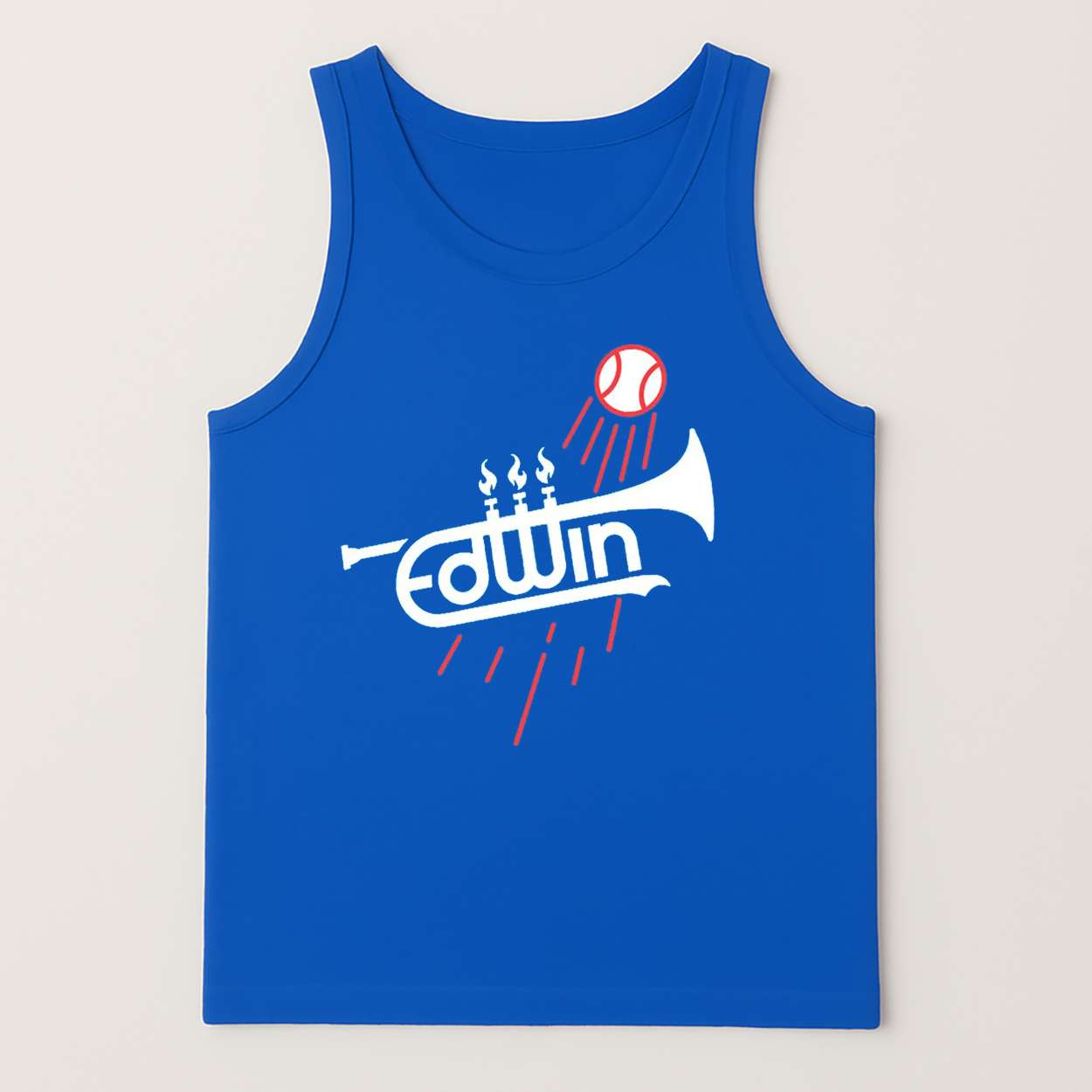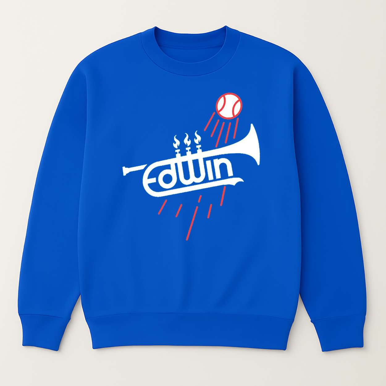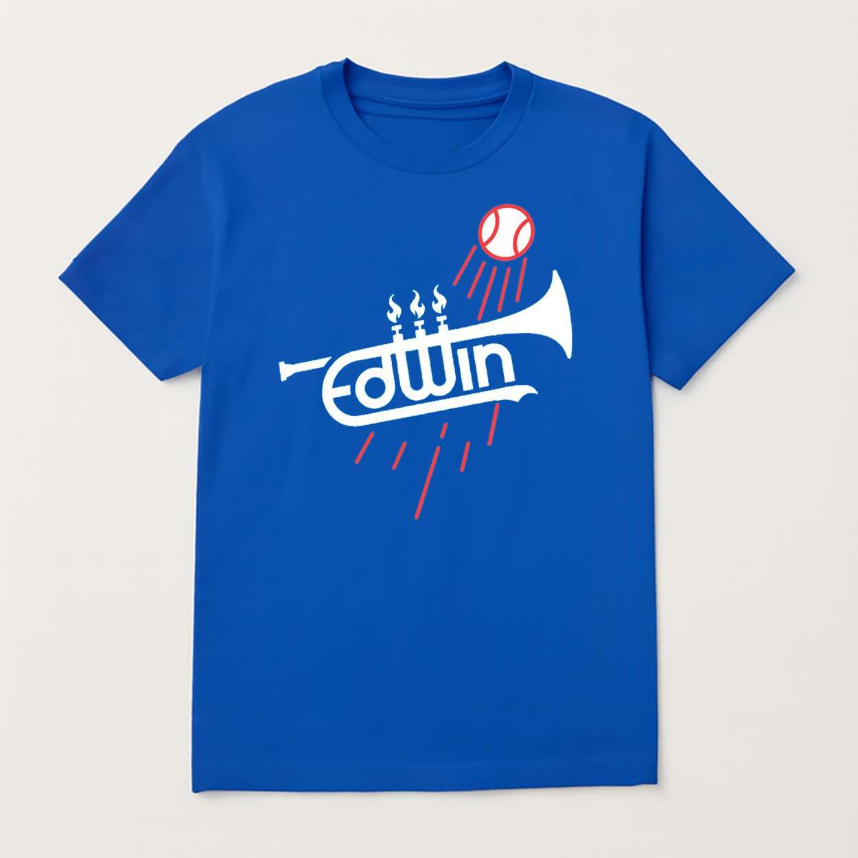 This shirt captures that energy: flames burst from trumpet valves, a baseball rockets skyward, and the name “Edwin” fuses into brass. It’s a tribute to rhythm, rivalry, and the power of performance—where music meets momentum and history meets hype.