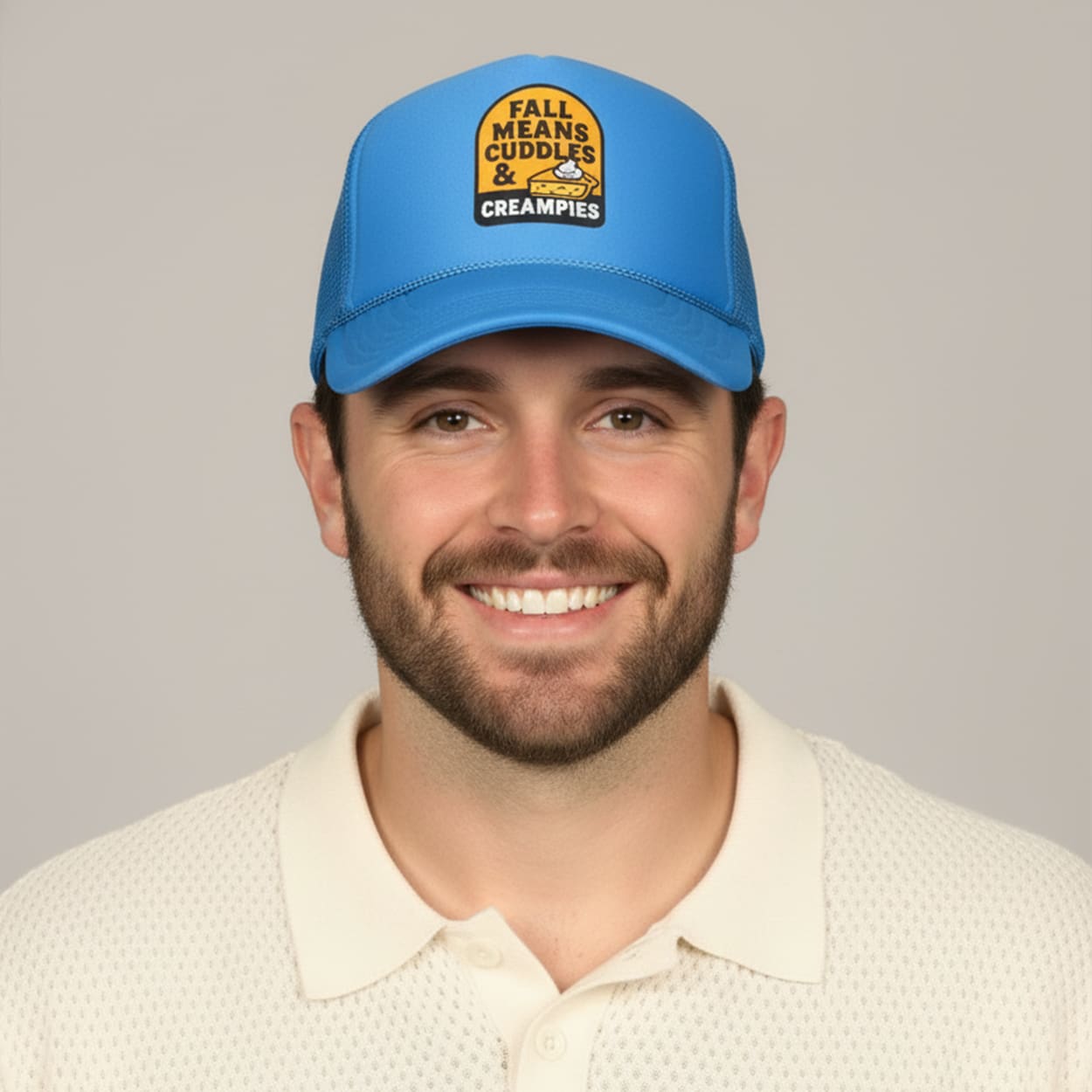 This trucker hat features a prominent yellow and black patch with the playfully suggestive text: “FALL MEANS CUDDLES & CREAMPIES”. The graphic includes an image of a slice of pie with a dollop of whipped cream, visually representing the literal meaning, while the suggestive double entendre provides the humor. The hat has a classic trucker style with a bright blue front panel and a breathable mesh back.