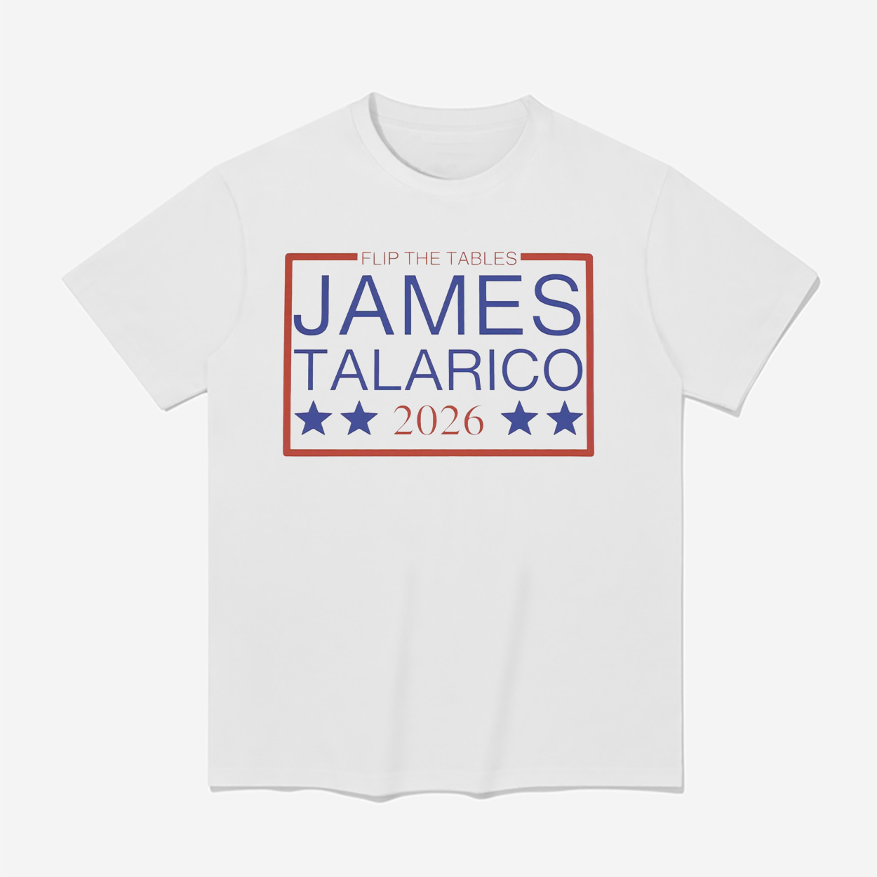 Make a definitive political statement with the Flip The Tables James Talarico 2026 Shirt. The front of this graphic tee features a classic, structured campaign logo enclosed within a solid rectangular border. The prominent text highlights the candidate’s name stacked cleanly above the election year “2026,” accented by a row of four traditional campaign stars. Breaking through the top line of the border is the powerful rallying cry, “FLIP THE TABLES,” delivering an authoritative and easily readable aesthetic designed for high visibility at public events.