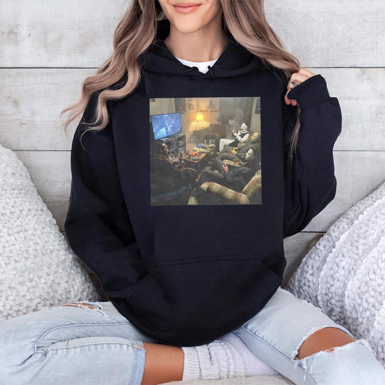 Make a killer statement with the Friday Night Game Night Graphic Tee. This striking graphic tee features a highly detailed, humorous illustration of legendary horror movie slashers hanging out in a dimly lit, messy living room. Instead of hunting victims, these infamous icons are casually lounging on sofas, gripping game controllers, and staring intensely at a glowing television screen. The artwork captures the ultimate couch co-op session, complete with snacks on the coffee table and a hazy, relaxed atmosphere.
