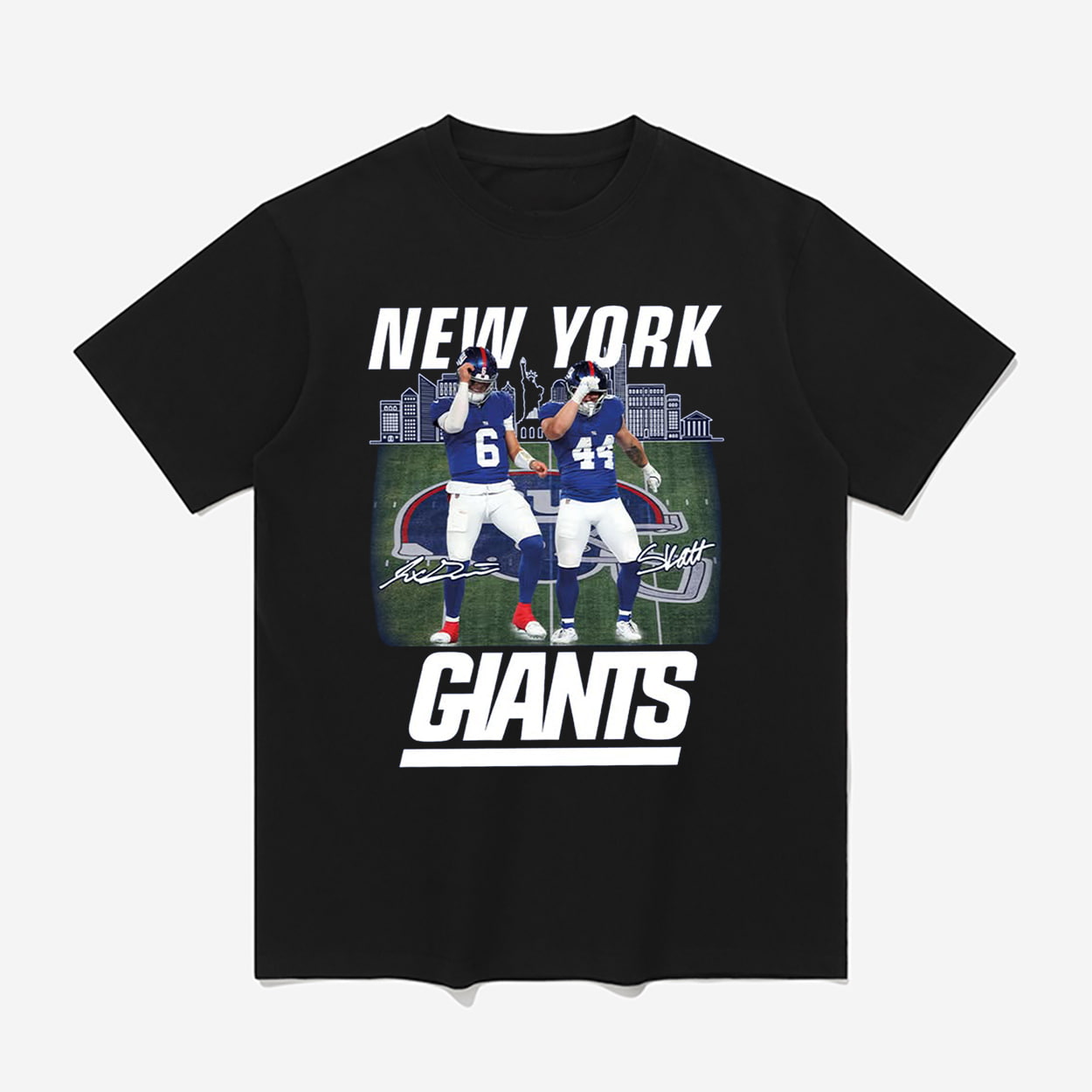 This shirt celebrates the New York Giants’ electric rookie tandem. The design prominently features the players’ names, Jaxson Dart (Number 6) and Cam Skattebo (Number 44), united by their popular nickname, “Skattebros”. It is a tangible memento of the energy and physical style of play that has revitalized the team’s offense, worn by fans to champion the new faces of the franchise.