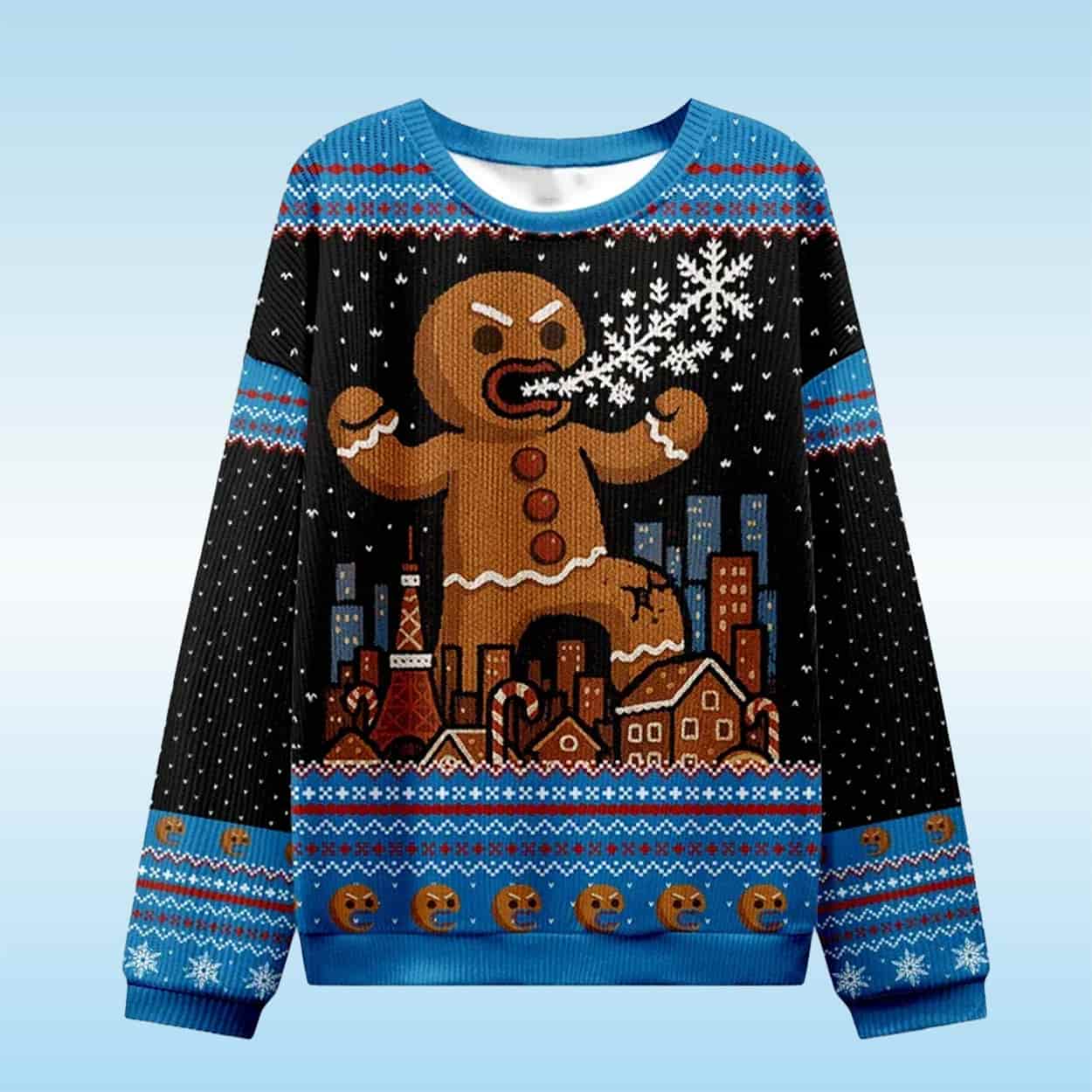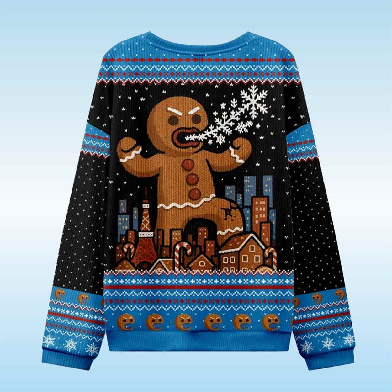 This unique garment brings a touch of hilarious terror to the festive season. The design centers on a giant, monstrous gingerbread man, complete with menacing icing and candy buttons, rampaging through a miniature, brightly decorated Christmas village. This graphic is set against a traditional, yet deliberately garish, holiday knit pattern, fully embracing the fun and humor of the ugly sweater tradition.