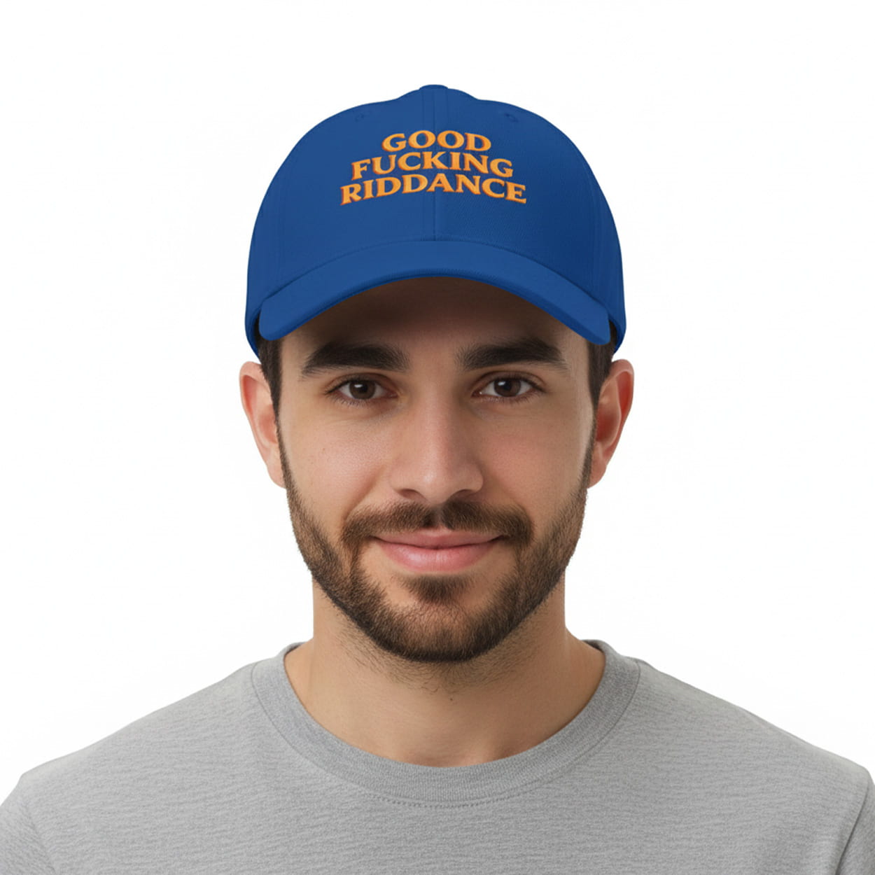 This baseball cap is a bold and iconic piece of New York City political history. The hat features the profane, celebratory phrase “GOOD FUCKING RIDDANCE” embroidered on the front in a striking, retro-style yellow and red 3D-effect font. It’s a simple, direct, and powerful statement piece.