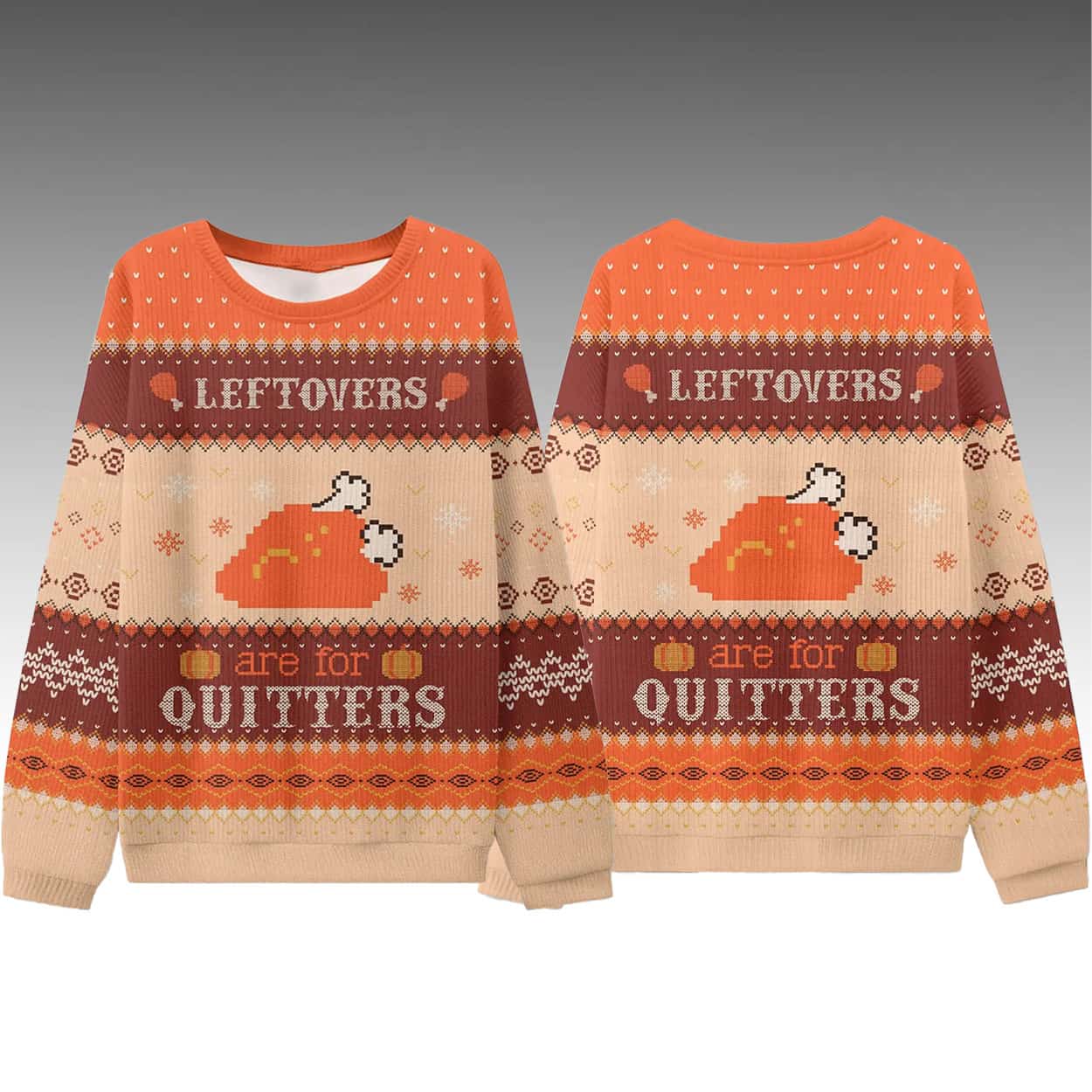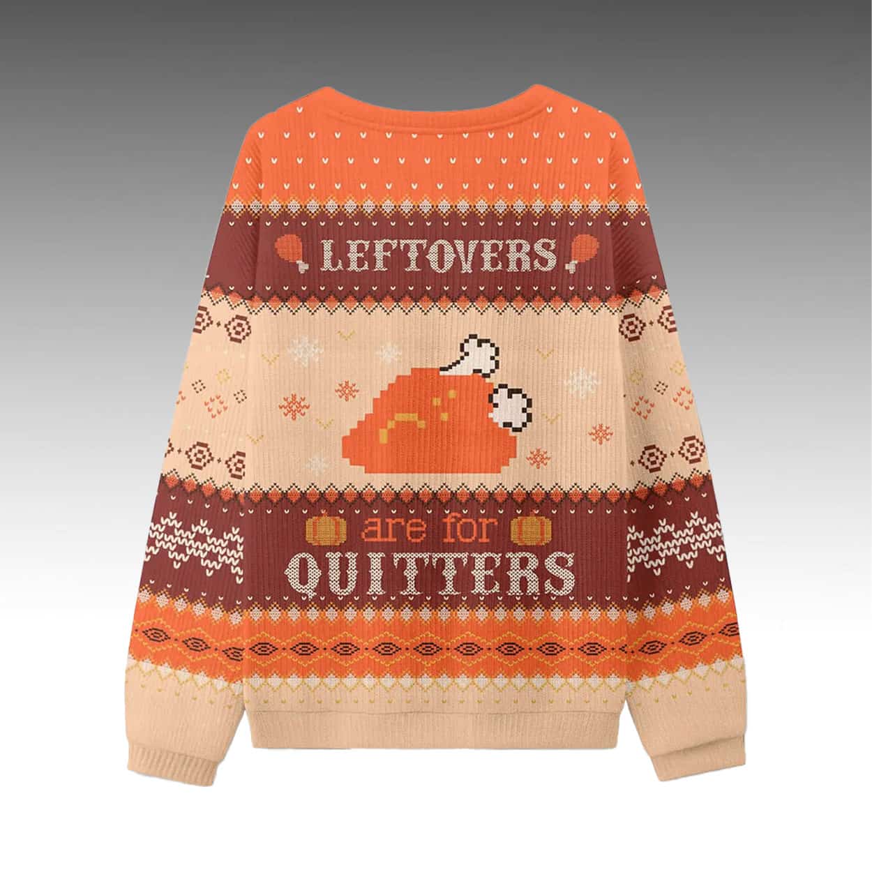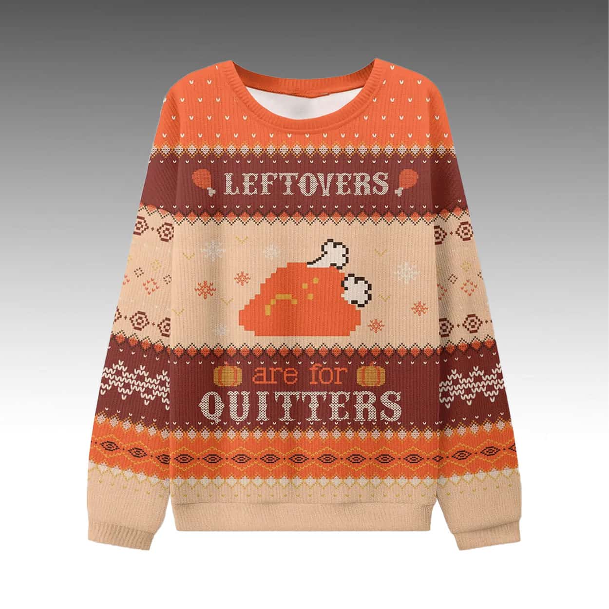 Embrace festive banter with the Grant Leonard Leftovers Are For Quitters Ugly Sweater. The design features “LEFTOVERS ARE FOR QUITTERS” in bold, rustic lettering across striped bands, centered around a smiling pixelated turkey graphic, with intricate patterns of snowflakes, diamonds, and geometric motifs in warm orange, brown, and beige tones for a classic ugly sweater aesthetic.
