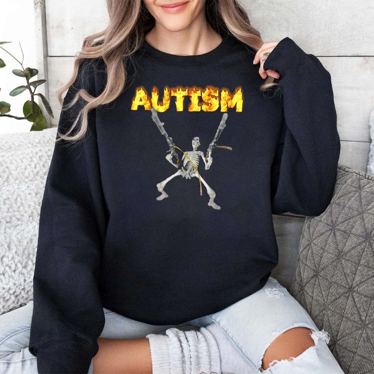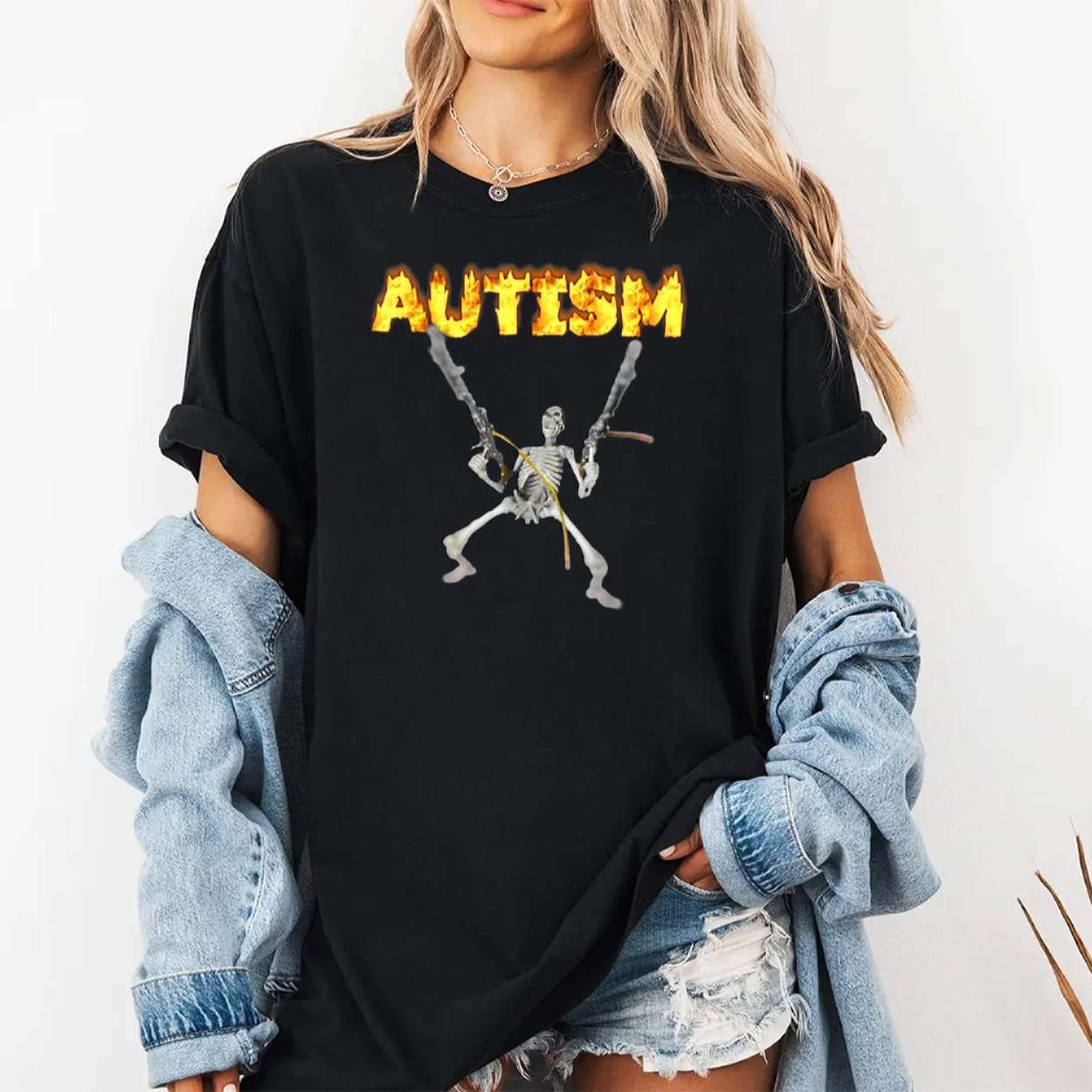 This design references the viral image of Greta Thunberg wearing the “AUTISM” skeleton tee paired with a keffiyeh. The shirt’s fiery lettering and skeletal figure dual-wielding rifles became an internet sensation for its stark mix of activism, identity, and meme symbolism.