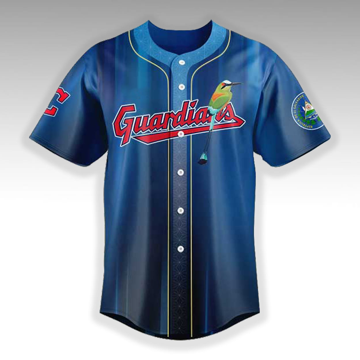 This baseball jersey features a striking gradient design adorned with meaningful cultural imagery. The front proudly displays the Guardians wordmark alongside a beautiful illustration of the Torogoz, the national bird of El Salvador. The sleeve features an authentic national emblem patch, while the back showcases elegant “El Salvador” script above the team’s iconic ‘C’ logo and a detailed silhouette of the Monumento al Divino Salvador del Mundo.