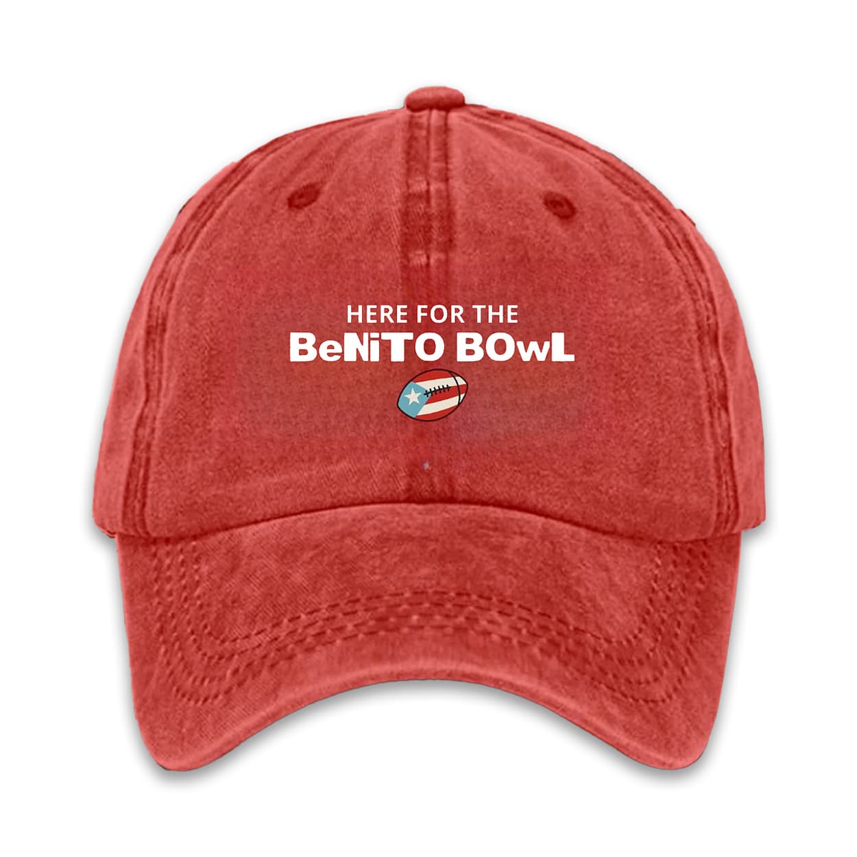 The cap showcases crisp printed mixed-case text reading “HERE FOR THE BeNiTO BowL,” paired with a bold red, white, and blue Puerto Rican-flag football graphic, all laid across a classic six-panel silhouette complete with a gently curved brim and an adjustable rear strap for a secure, personalized fit.