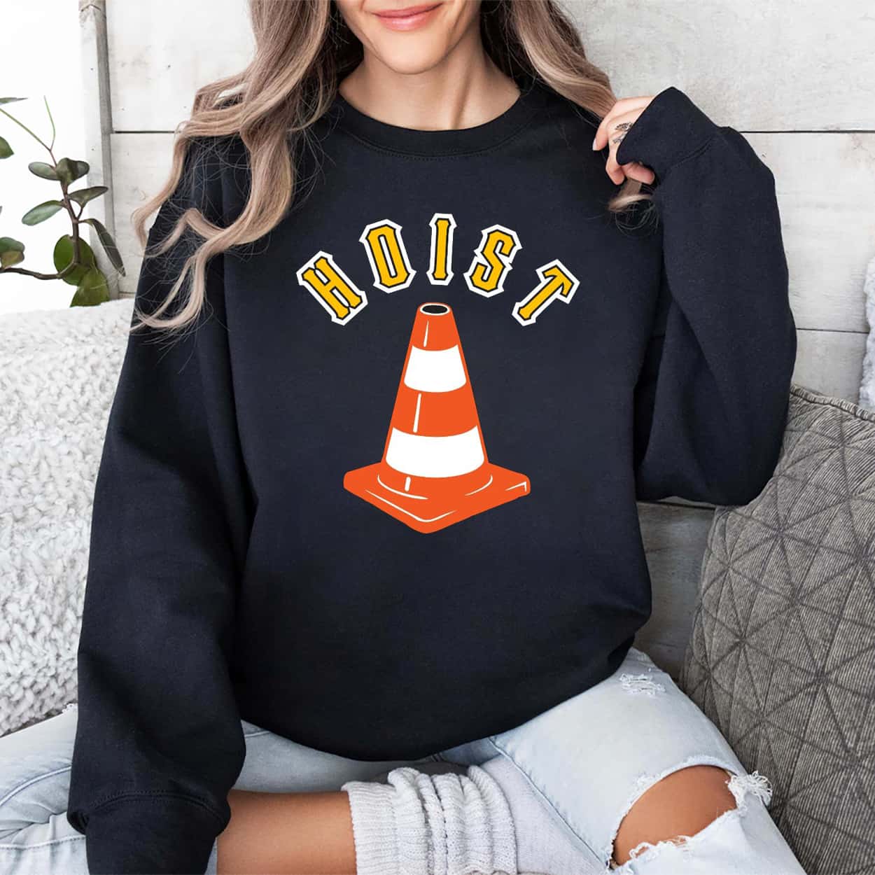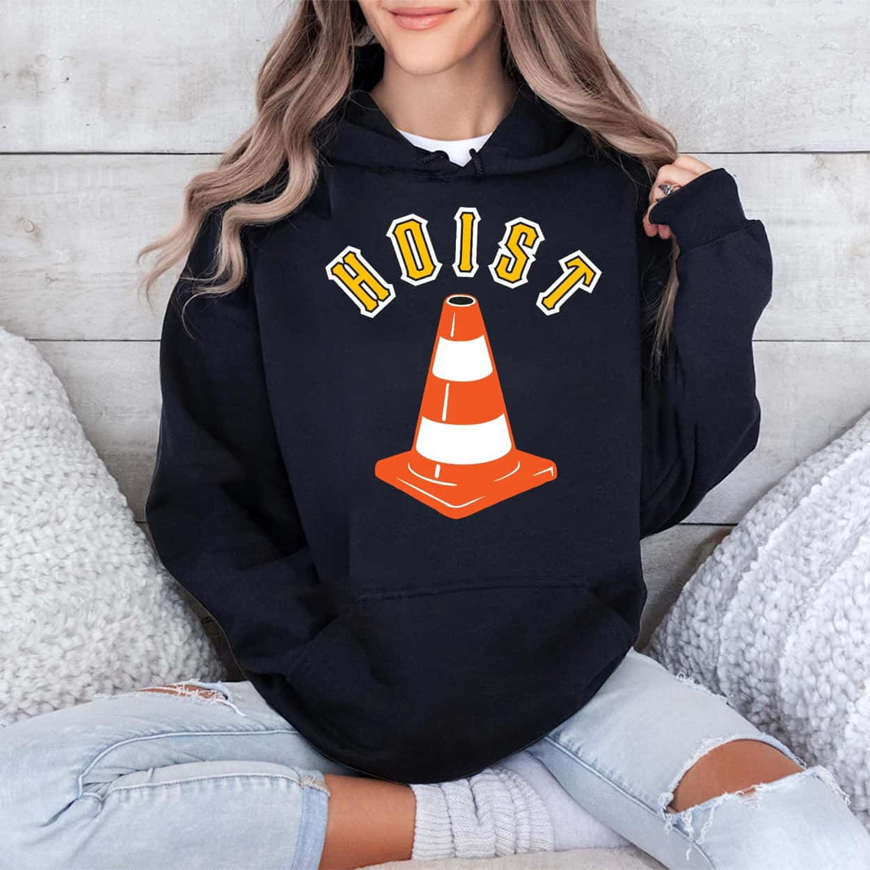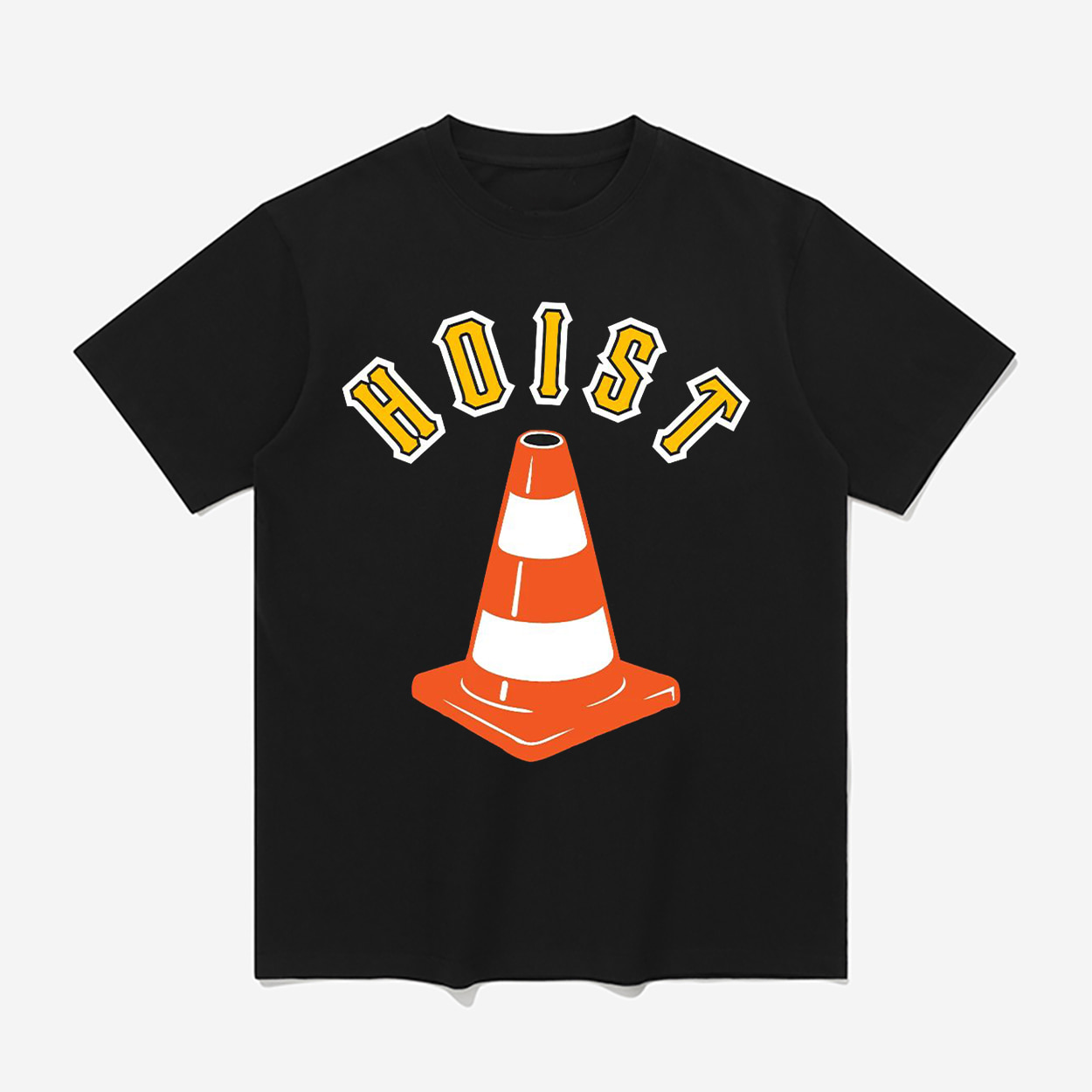 Make a bold statement with a design that captures the wildest new rallying cry in baseball. The shirt is anchored by the word “HOIST” displayed in a large, arched athletic block font. Positioned directly below the prominent typography is a striking, oversized illustration of a construction traffic cone, delivering a clean, minimalist, and hilarious aesthetic that instantly grabs attention.