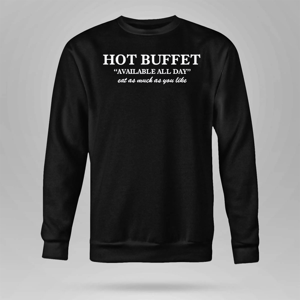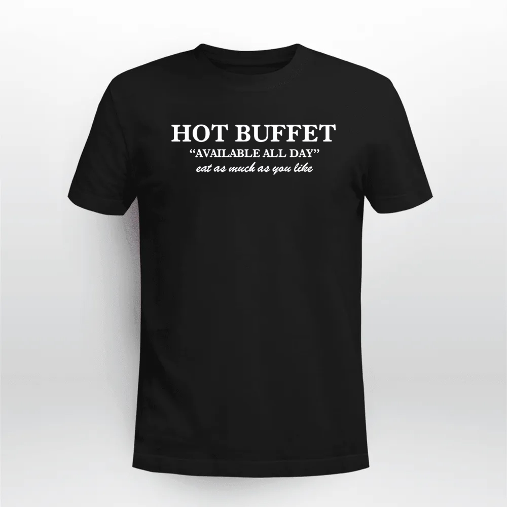 Wear this iconic Hot Buffet Available All Day Eat As Much As You Like Shirt—the exact graphic tee seen worn by celebrities and trending across social media. This comfortable, casual top is a witty, bold statement piece that recognizes internet culture and ironic fashion. Get this conversation starter for your collection now!