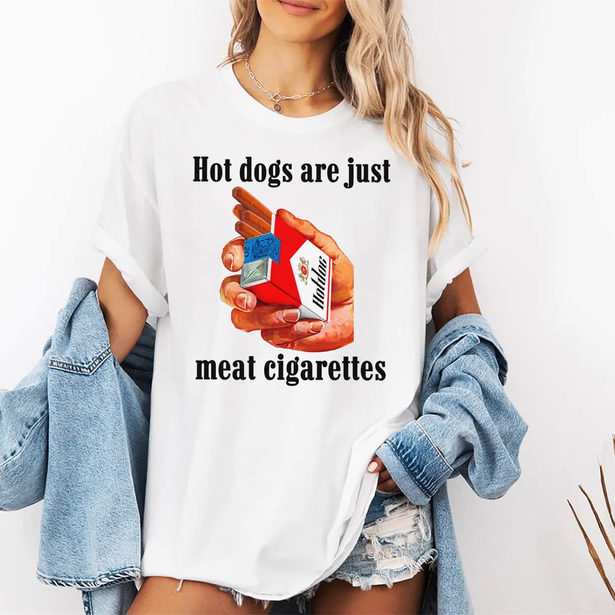 Adding this statement tee to your wardrobe guarantees a massive conversation starter for summer barbecues, casual weekend hangouts, or local comedy shows. It evokes a feeling of shared community laughs, lighthearted absurdity, and undeniable comedic flair. Show off your playful personality and your elite internet knowledge wherever you go. Order the Hot Dogs Are Just Meat Cigarettes Shirt right now and serve up some laughs!