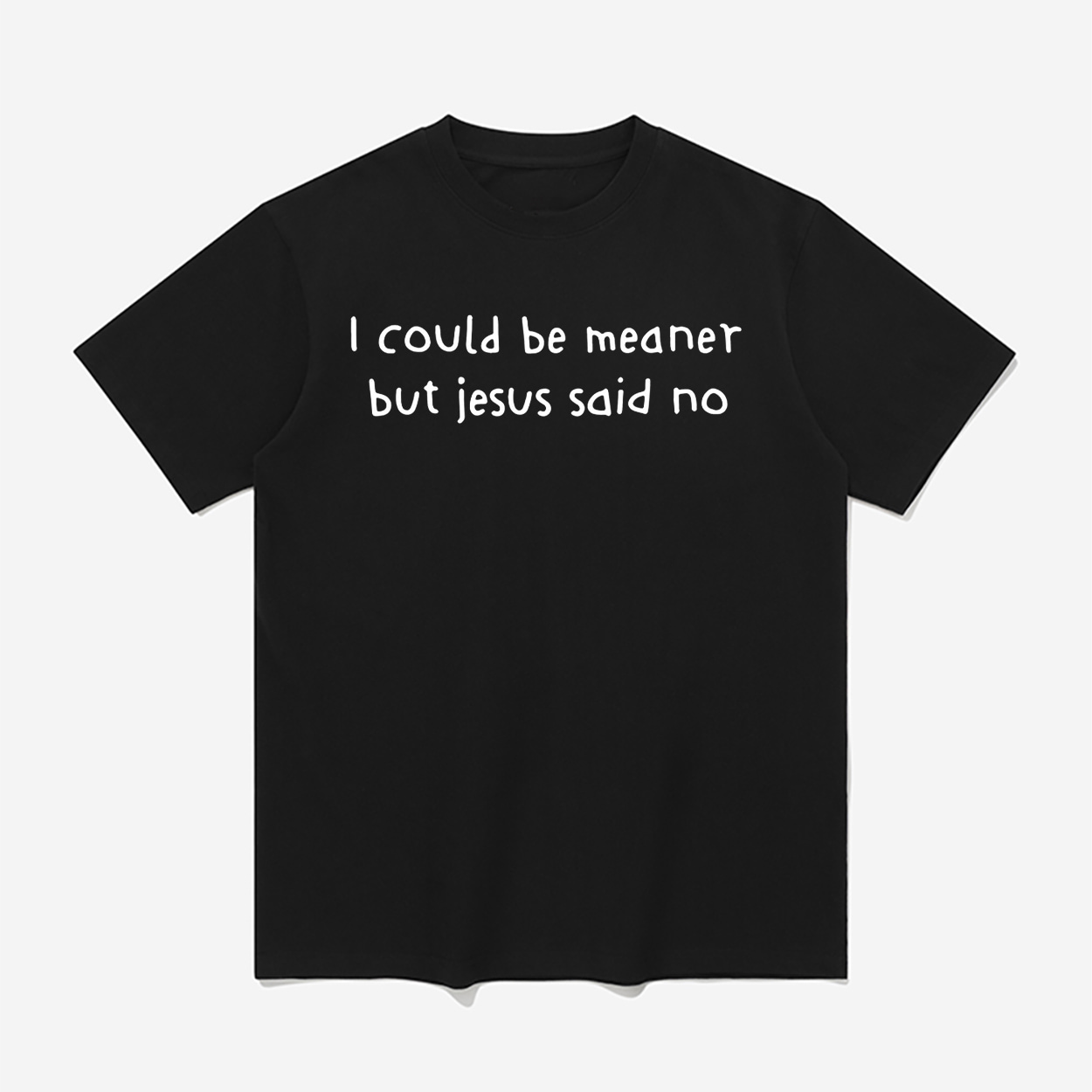 This minimalist t-shirt features a hilarious, relatable graphic that instantly catches the eye. The front proudly displays the popular phrase, “I could be meaner but jesus said no,” printed in a casual, handwritten-style font across the chest. It perfectly blends everyday casual wear with trendy, lighthearted internet humor.