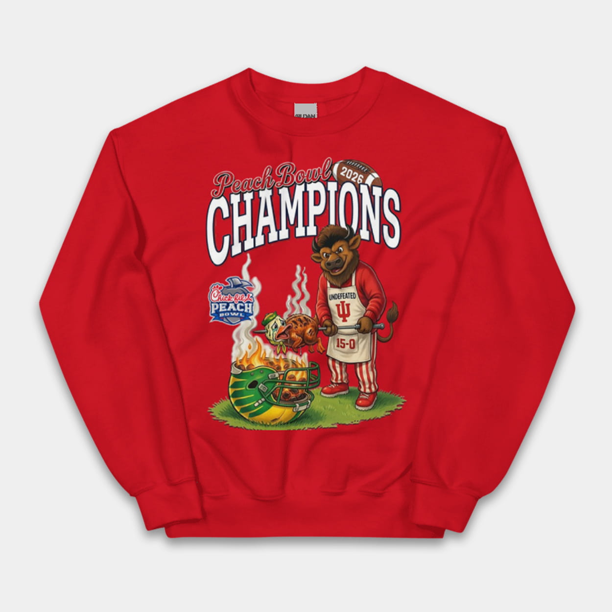 Celebrate the perfect season with the Indiana Hoosiers 2026 CFP Peach Bowl Champions Shirt! This hilarious victory tee features the IU Bison roasting the Oregon Duck over a burning helmet, commemorating the historic 15-0 undefeated run. With official Peach Bowl branding and “Champions” text, it’s the ultimate keepsake for Hoosier fans who want to savor the sweet taste of victory. Own the moment history was made.