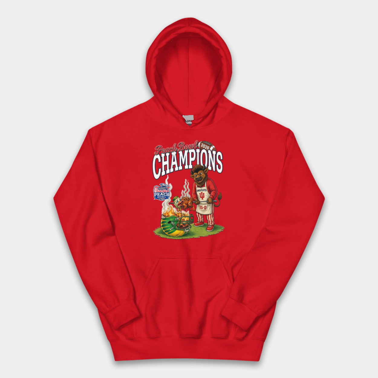 Savor the flavor of a perfect season with this bold victory graphic tee. The shirt features a vibrant, humorous illustration of the Indiana Hoosiers Bison mascot wearing an apron that proudly reads “UNDEFEATED” with the classic IU logo and the historic record “15-0”. The mascot is depicted roasting a caricature of the Oregon Duck on a spit over a fire fueled by a burning green and yellow Oregon helmet. The design is crowned with “Peach Bowl 2026 CHAMPIONS” text and includes the official Chick-fil-A Peach Bowl logo.
