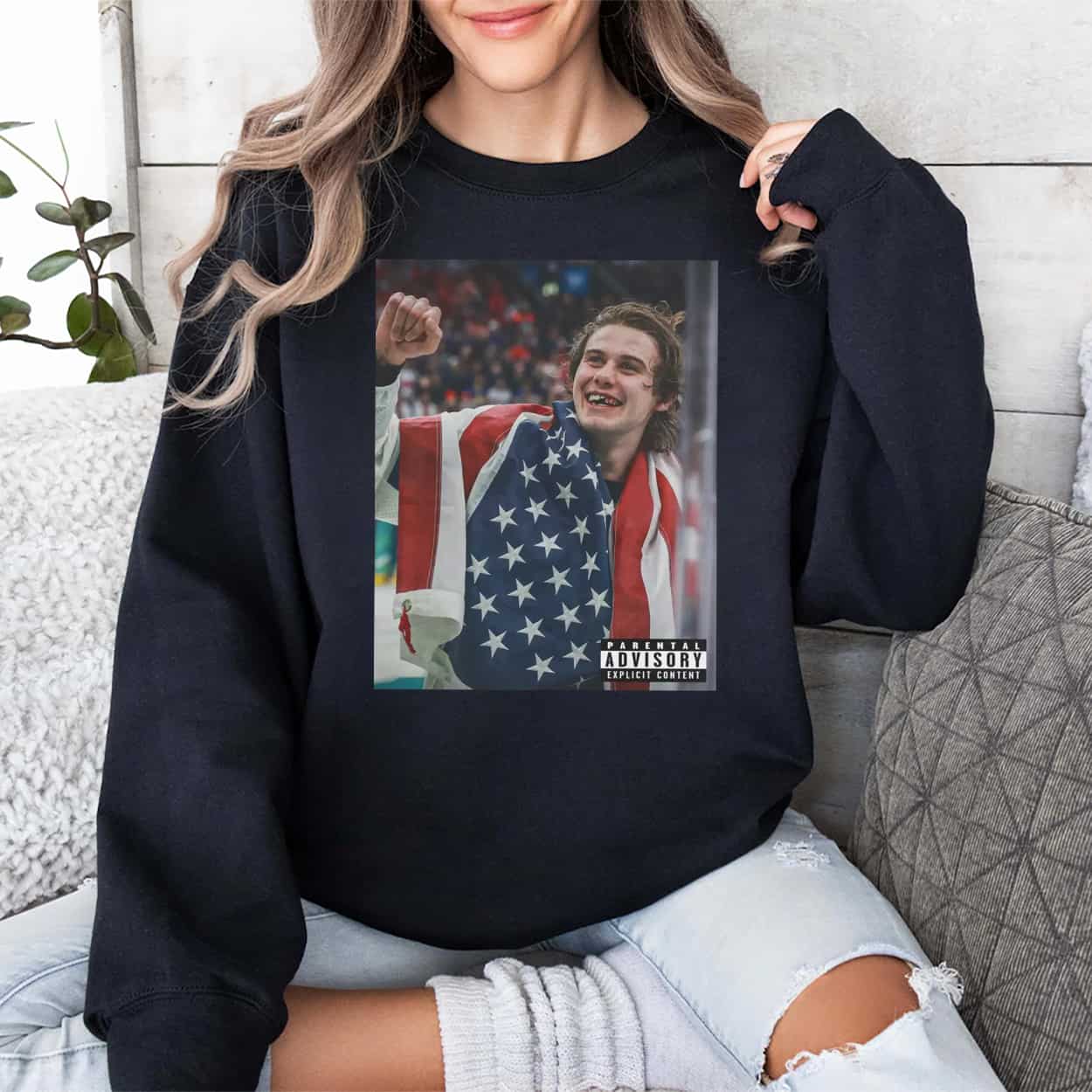 Bring home the glory of the ice with this exclusive Jack Hughes USA Hockey Gold Medal Shirt. Printed on a comfortable, premium black cotton tee, the centerpiece is a striking, high-definition photo graphic of the American hockey superstar celebrating the ultimate victory. Hughes is captured mid-fist pump, proudly draped in the Stars and Stripes, showing off a gritty, euphoric missing-tooth smile. The design is brilliantly finished with a retro “Parental Advisory Explicit Content” label in the bottom corner, giving this championship moment the unapologetic swagger of a classic hip-hop album cover.
