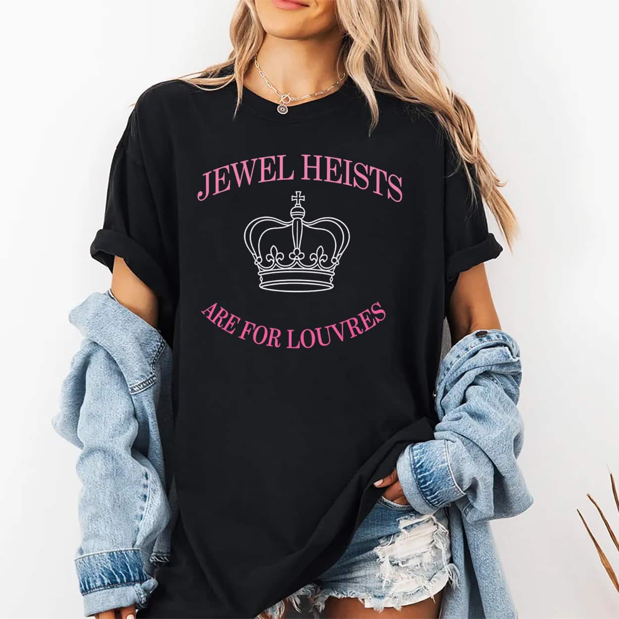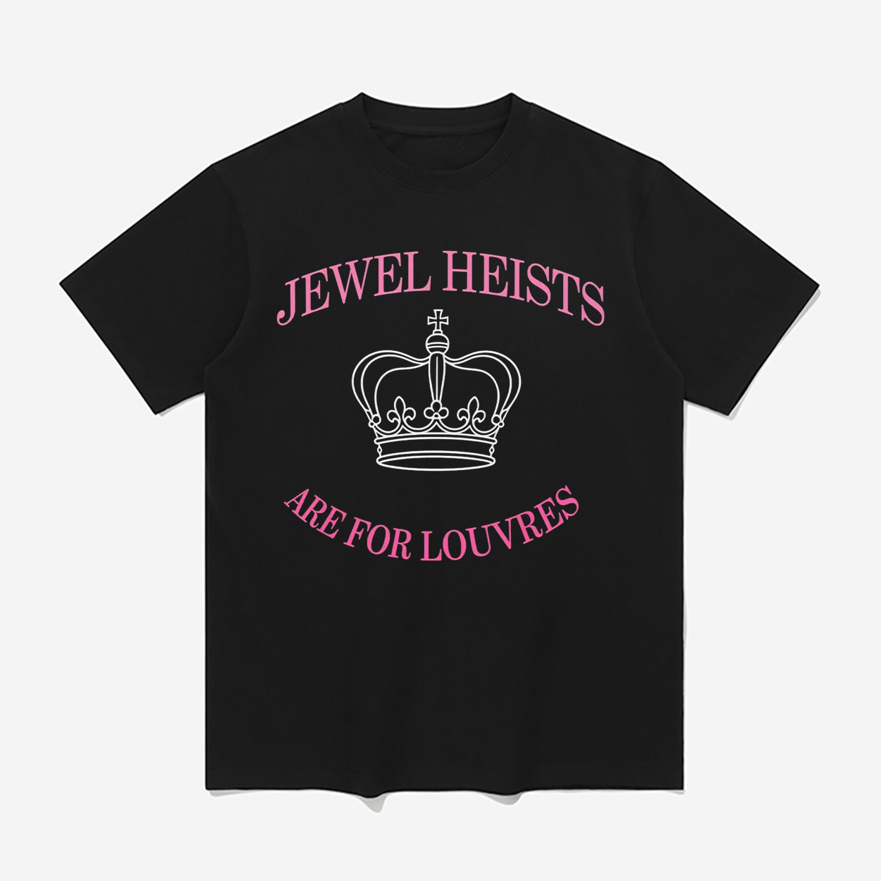 This t-shirt features the phrase “JEWEL HEISTS” and “ARE FOR LOUVRES” in a bold, stylized pink font. Between the text is a simple, white line-art graphic of a royal crown, perfectly underscoring the “heist” theme. The combination of the black shirt and the vibrant pink text gives it a modern, eye-catching look.