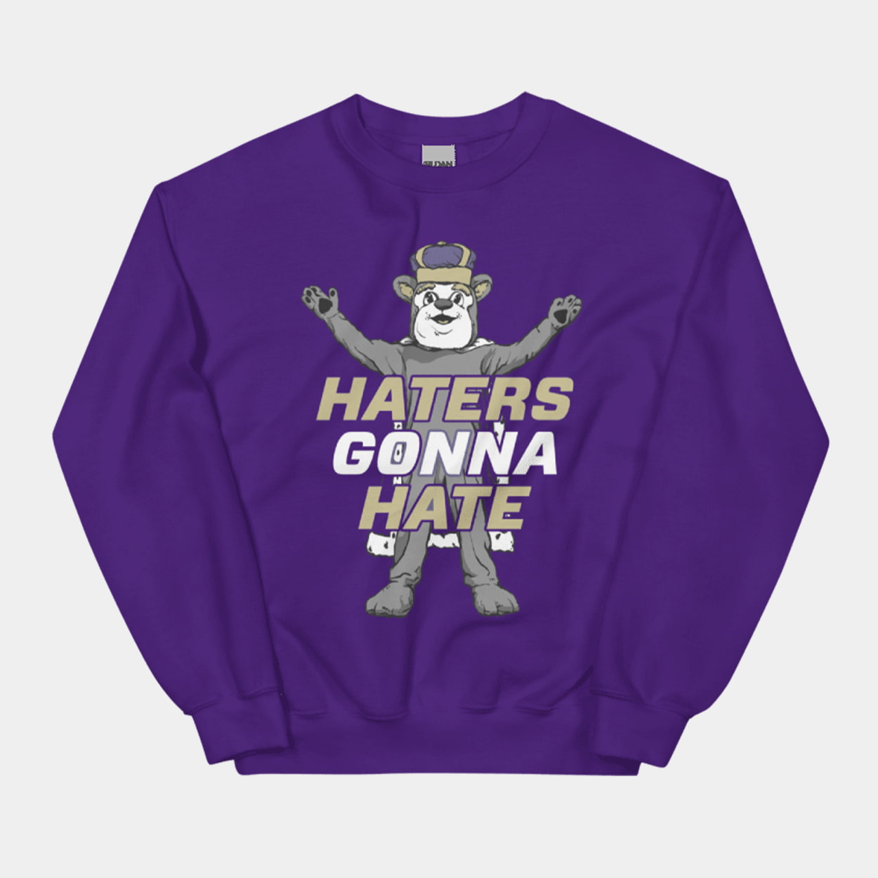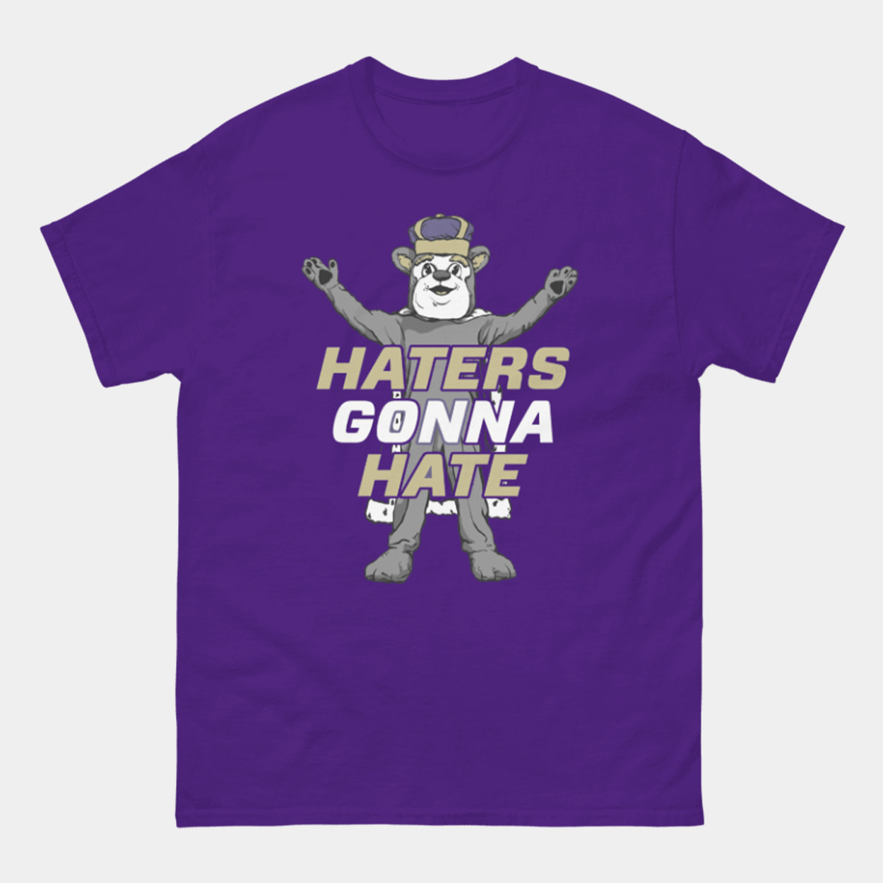 This t-shirt centerpiece is the iconic James Madison University Duke Dog mascot, depicted in full regalia with his arms spread in a triumphant or defiant pose. Overlaying the graphic is the bold, layered text: “HATERS GONNA HATE,” rendered in JMU’s signature colors—gold and white. The design is clean, spirited, and instantly recognizable as true James Madison fan gear.