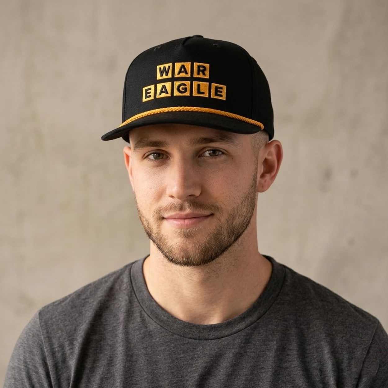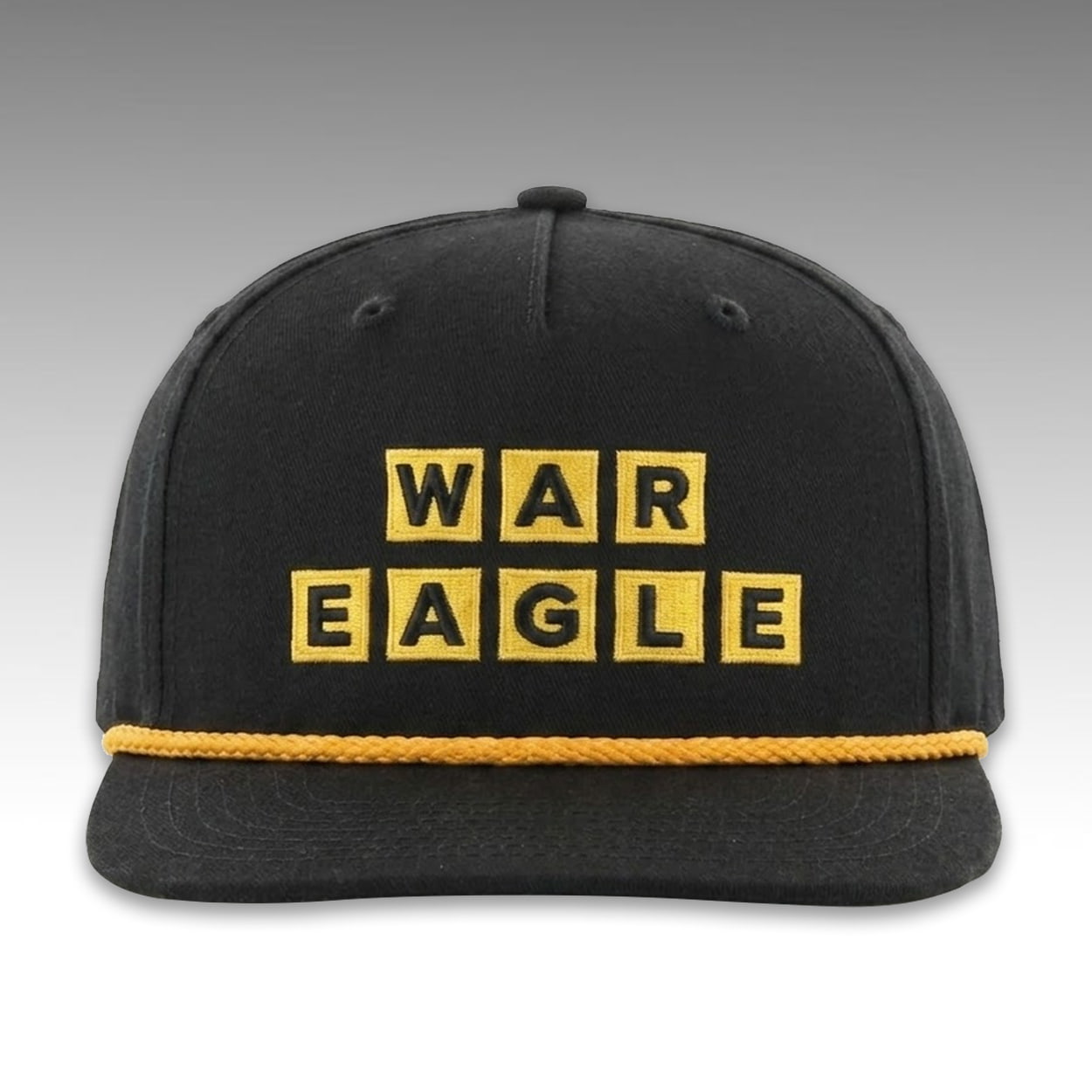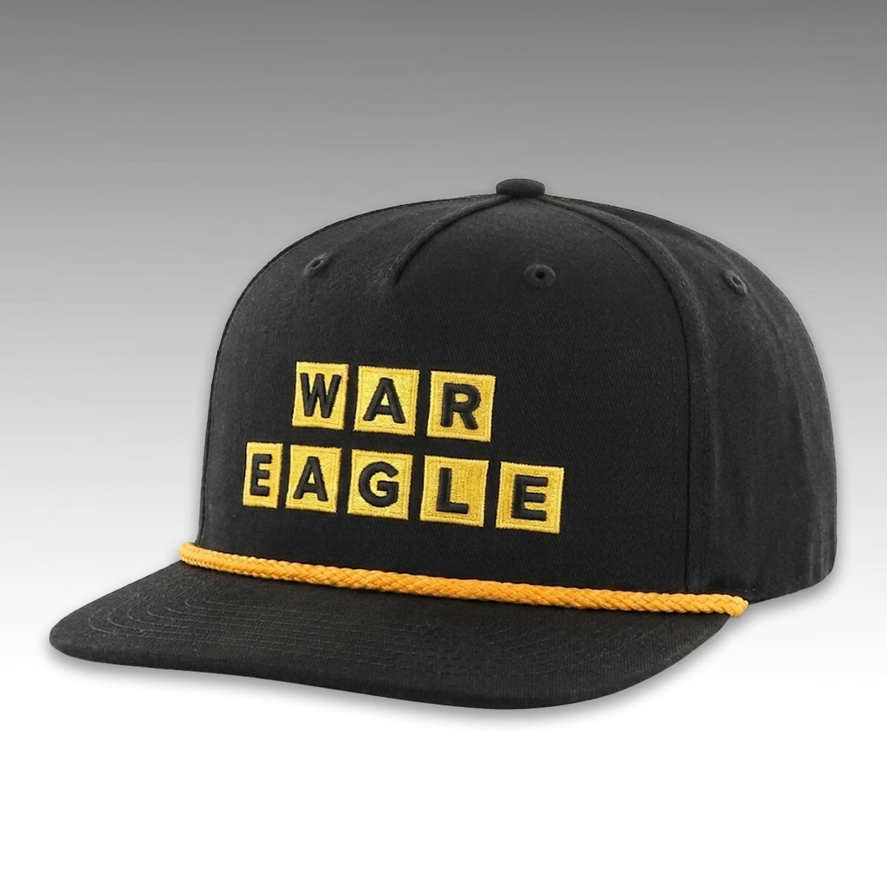 This vintage-style cap features a dark, structured crown paired with a contrasting flat brim. The front proudly displays the iconic “WAR EAGLE” battle cry, with each letter boldly embroidered inside individual block squares. A classic braided rope stretches across the base of the visor, delivering a highly sought-after retro athletic finish.