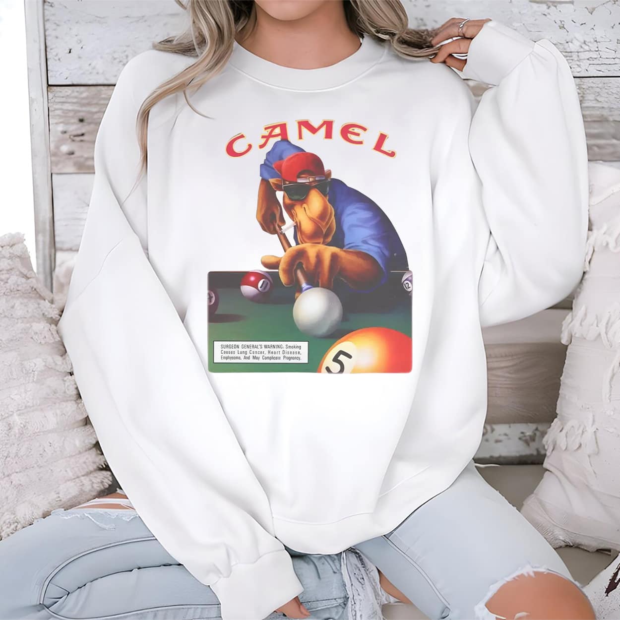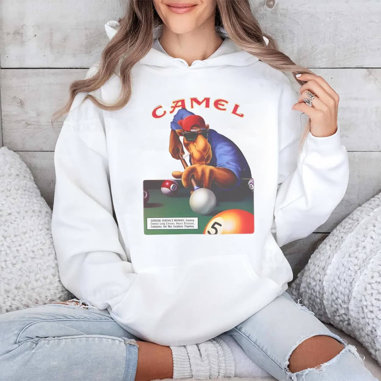 Make a nostalgic statement with the Joe Camel Cigarettes 75th Birthday Shirt. This graphic tee features classic 90s advertising artwork of the iconic Joe Camel mascot leaning over a billiards table to take a shot. Wearing his signature sunglasses and backward cap, the character is framed by the arched “CAMEL” logo at the top and an authentic-looking Surgeon General’s warning box at the bottom.