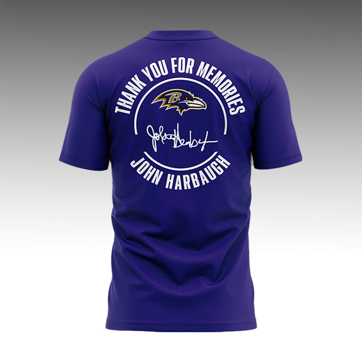 Celebrate a coaching legend with the John Harbaugh Thank You For Memories Shirt. The front boldly displays “JOHN HARBAUGH” in white text with the Ravens logo below for a clean homage, while the back encircles the raven head with “THANK YOU FOR MEMORIES” in arched white lettering, featuring Harbaugh’s signature underneath.