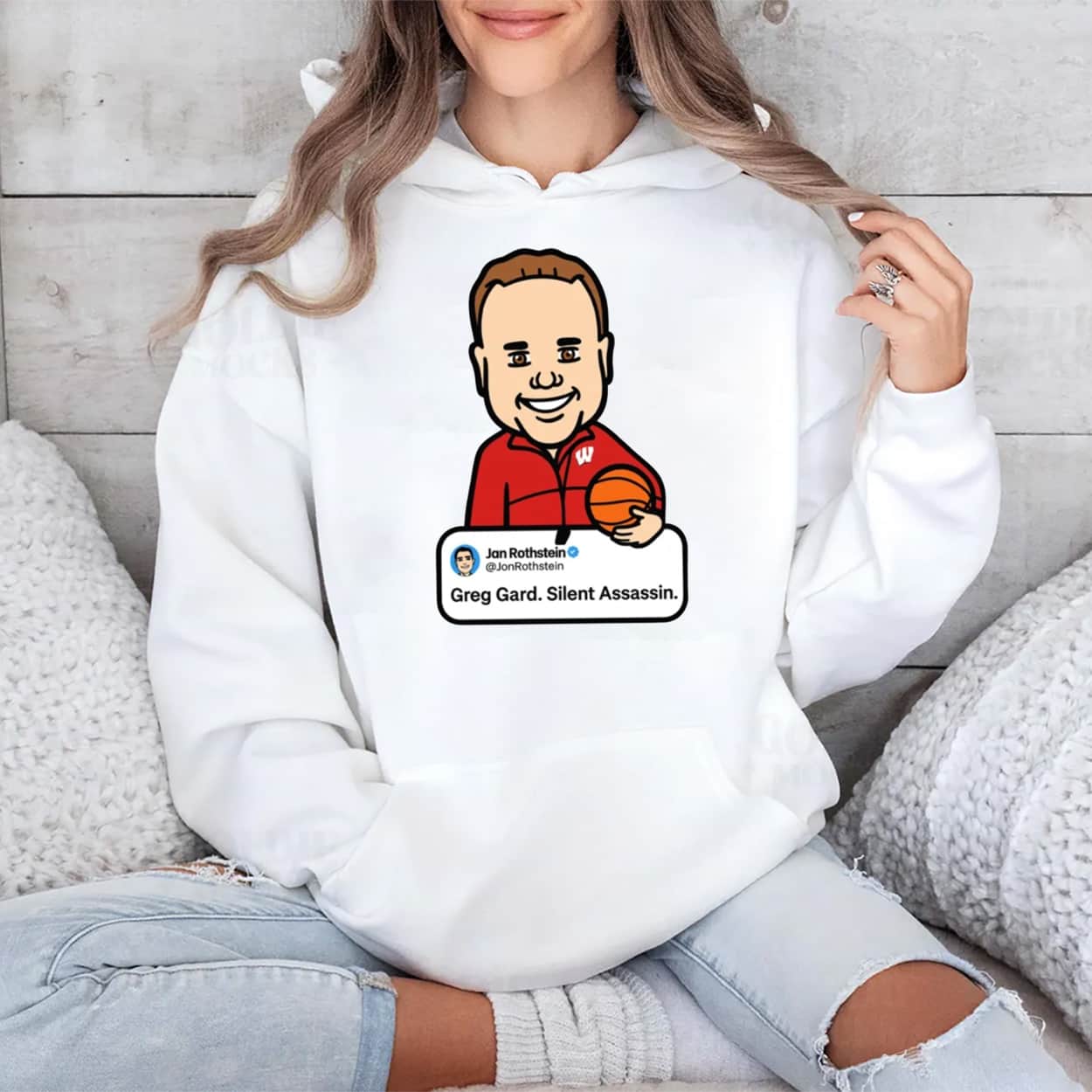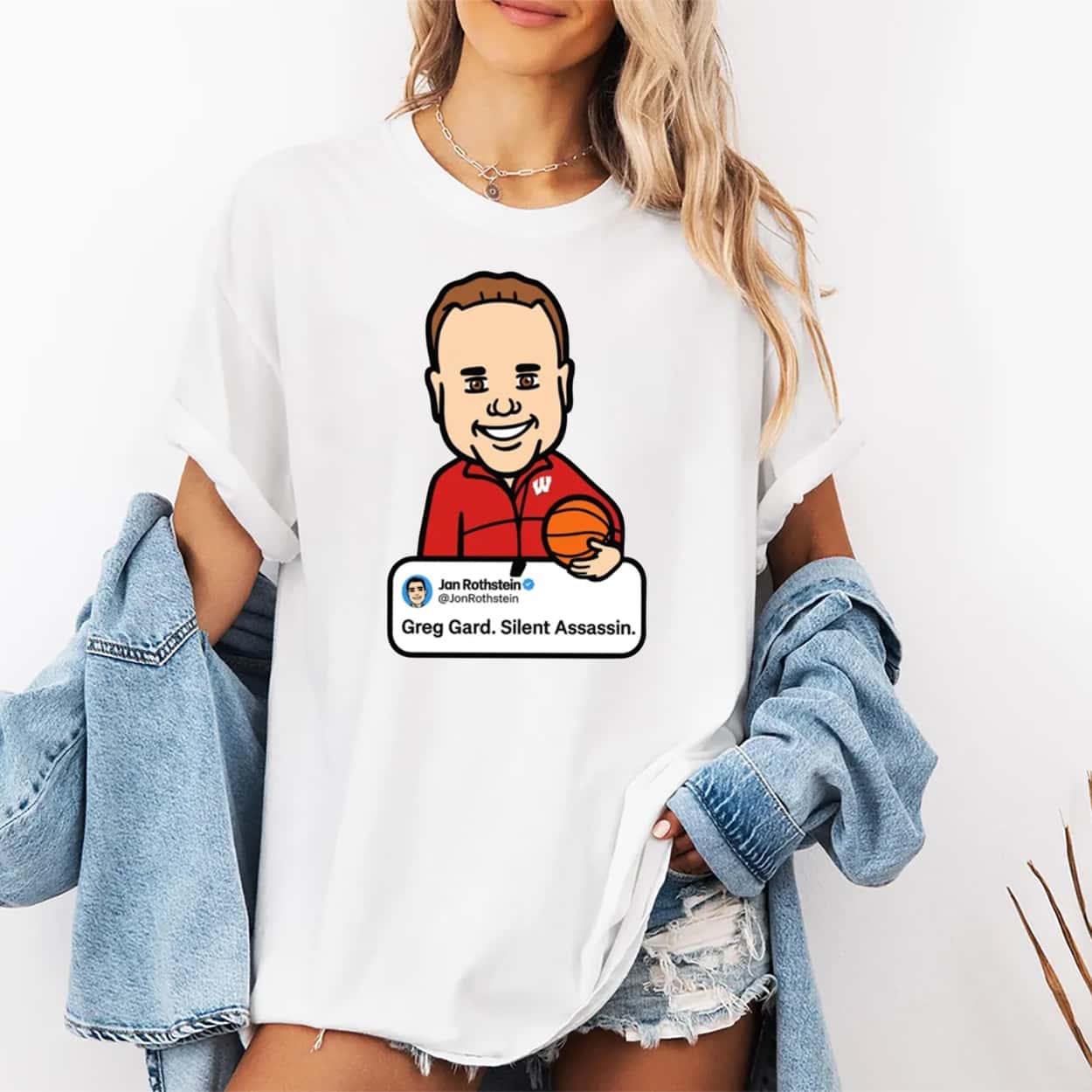 This shirt draws from college basketball insider Jon Rothstein’s recurring phrase “Greg Gard. Silent Assassin,” popularized in his X posts praising the Wisconsin coach’s understated yet effective style, including during the Badgers’ strong 2025 season with a 5-1 start.