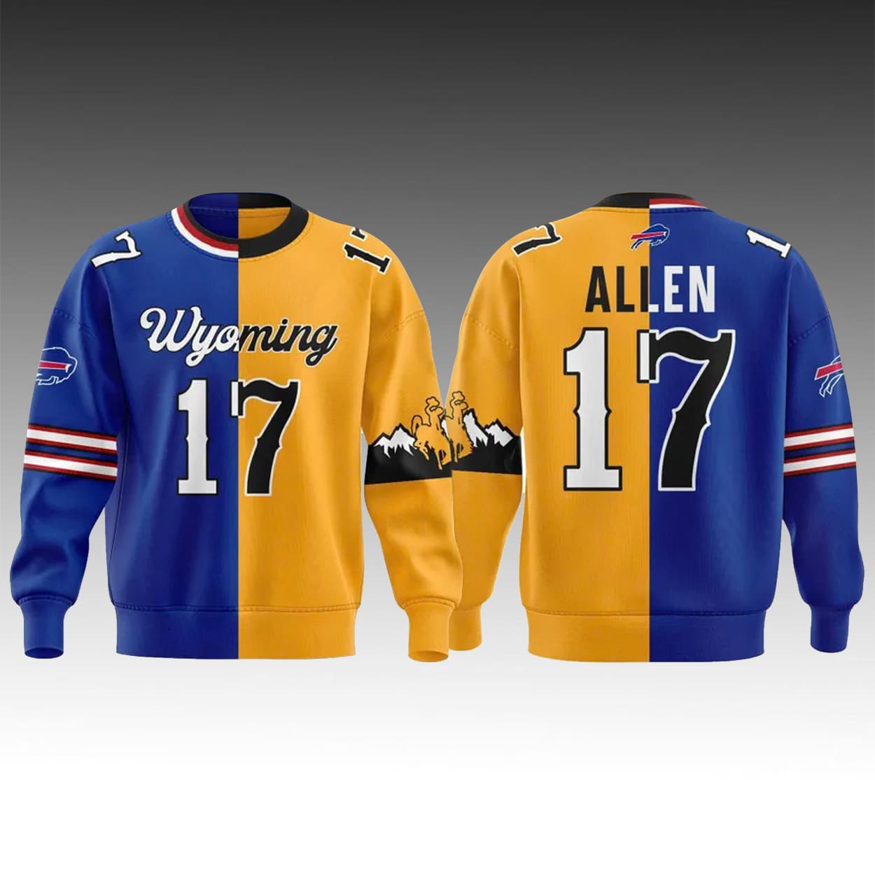 Show your allegiance with the Josh Allen 17 Bills x Wyoming Cowboys Hoodie. The design boasts a striking split-color scheme—royal blue on one half with Bills-inspired red-white stripes on the sleeves and number 17, transitioning to gold on the other with “Wyoming” in cursive script, a mountain silhouette, and cowboy motifs. The back displays “ALLEN” arched above 17, merging both team aesthetics seamlessly for a hybrid tribute.