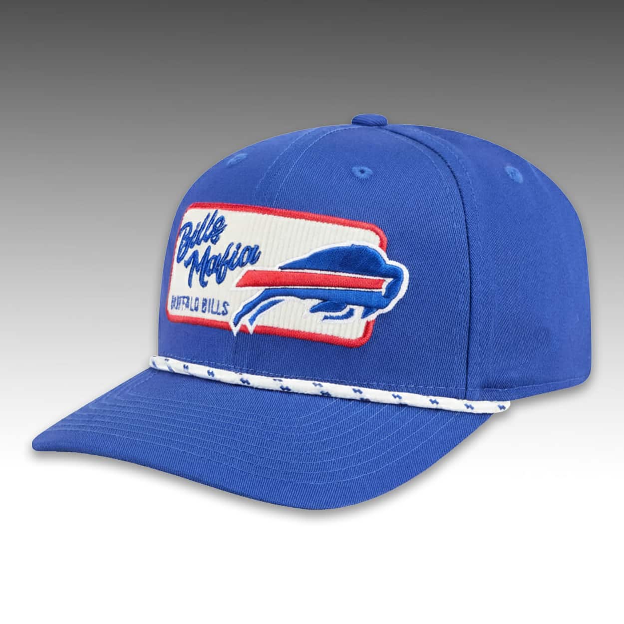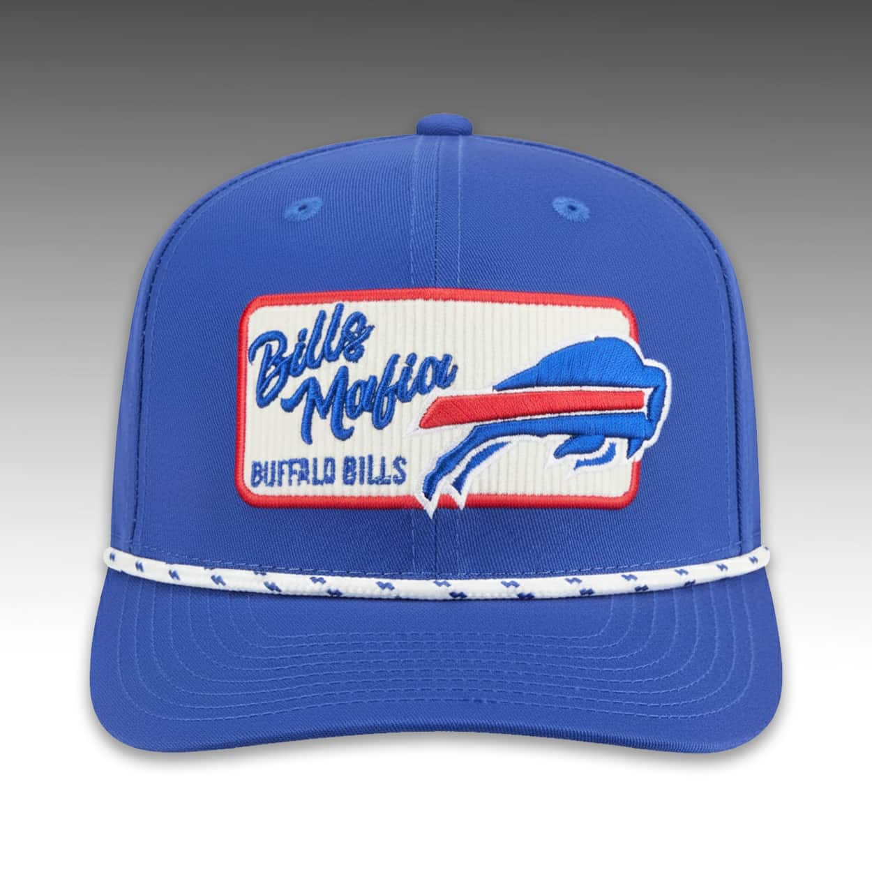This Bills hat makes a bold statement with its unique, retro-inspired design. It features a classic rope across the brim and a large, detailed patch on the front. The patch proudly displays the “Bills Mafia” script in blue, set next to the iconic charging buffalo logo, which breaks the border in a dynamic pose. The “Buffalo Bills” name is anchored below, completing this standout fan design.