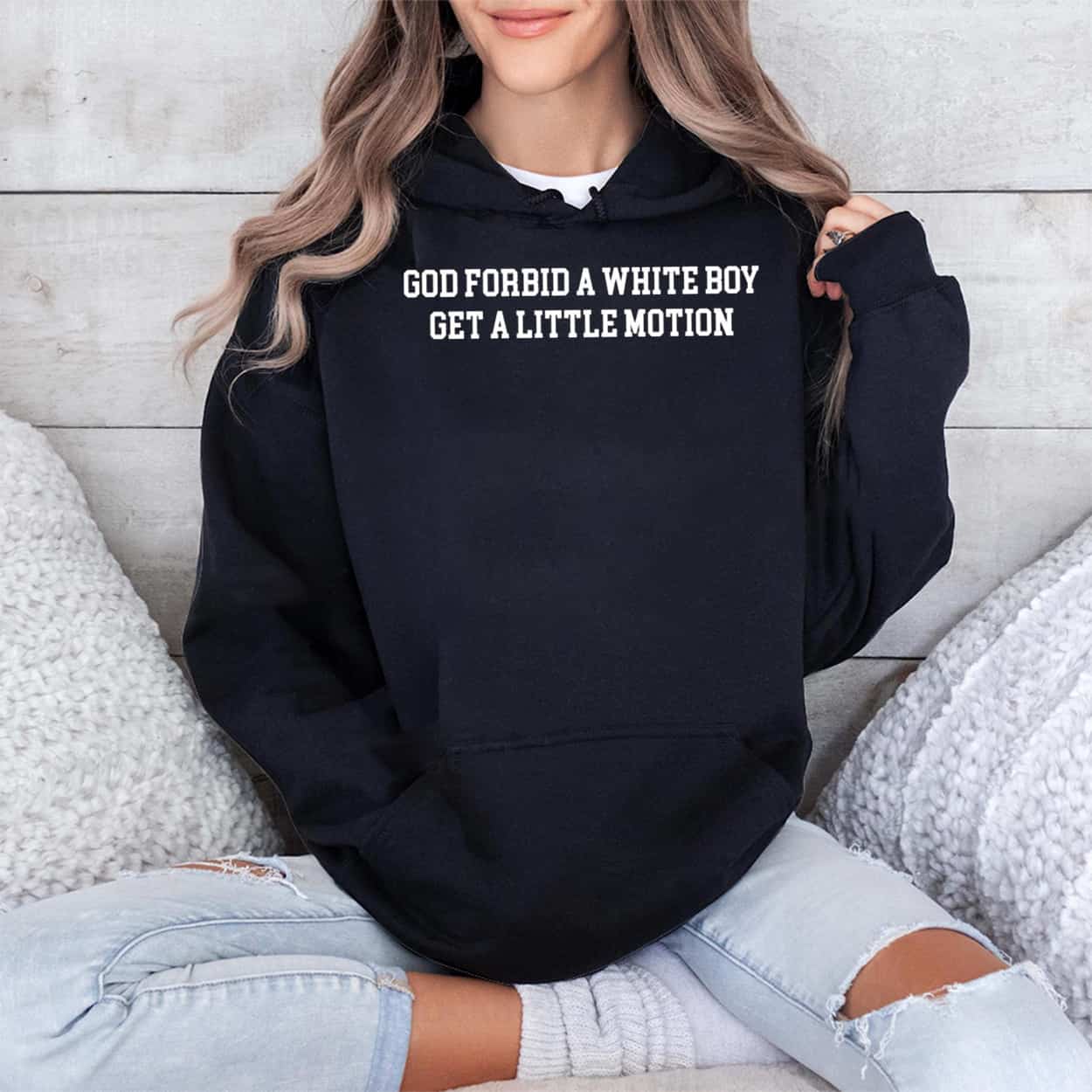 The Josh Whyle God Forbid A White Boy Get A Little Motion Shirt features a striking design with “GOD FORBID A WHITE BOY GET A LITTLE MOTION” in clean, athletic-style font. The minimalist graphics emphasize the bold statement for maximum visual punch.