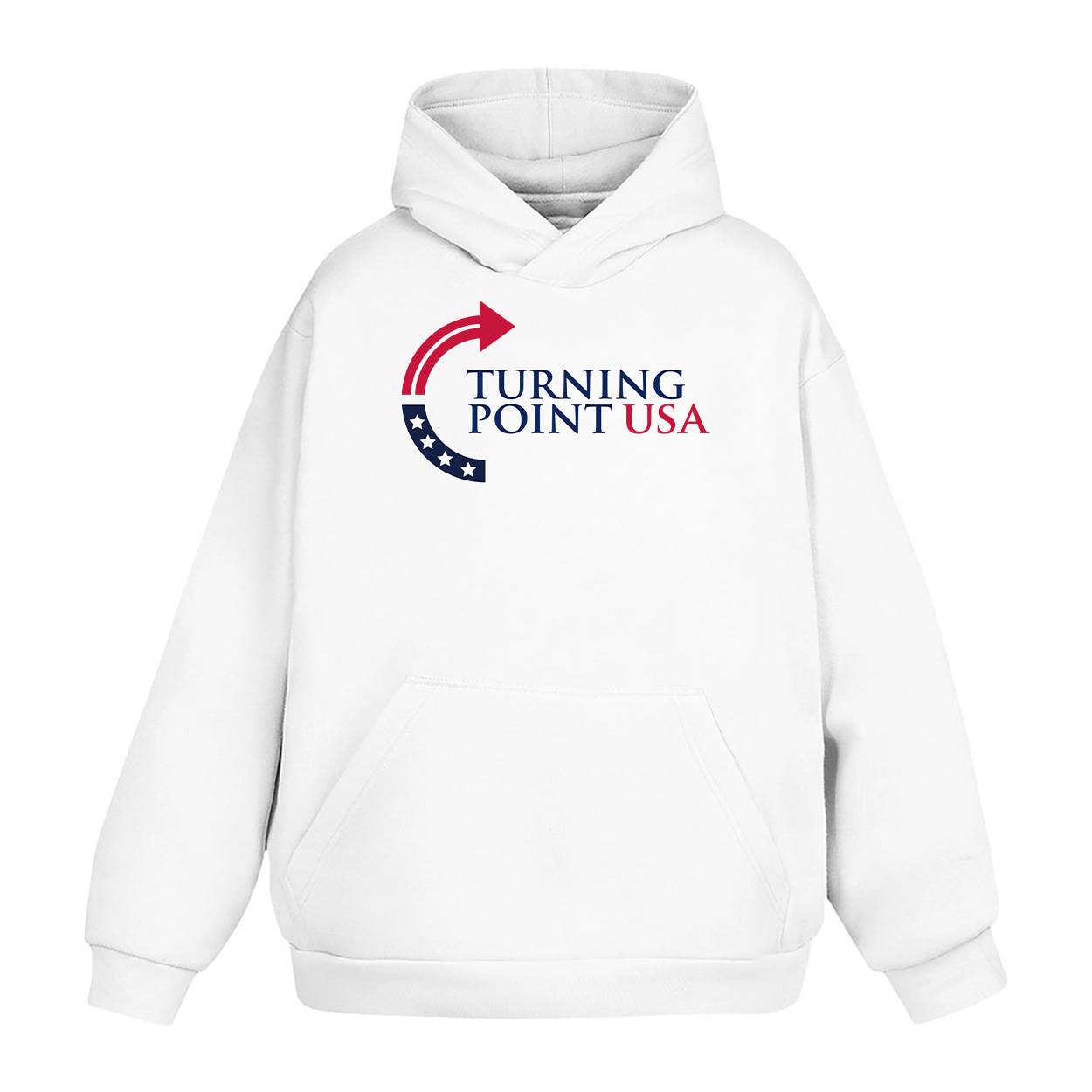 This Justin Bieber Turning Point USA hoodie delivers a headline-making streetwear moment that channels celebrity-inspired aesthetics and clear political branding. The hooded pullover places the TURNING POINT USA text and a circular arrow emblem with star motifs on the chest for instant recognizability while maintaining a comfortable, relaxed unisex fit and practical front pocket for everyday wear. The garment is designed to photograph well and read clearly in crowd and media settings.